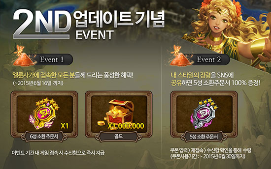 °ÔÀÓºôÀº À̹ø ¾÷µ¥ÀÌÆ®¸¦ ±â³äÇÏ¿© ´Ù¾çÇÑ ÇÁ·Î¸ð¼Çµµ ÁøÇàÇÑ´Ù. ³»´Þ 16ÀϱîÁö °ÔÀÓ¿¡ Á¢¼ÓÇÏ´Â ¸ðµç À¯Àúµé¿¡°Ô ¡®6¼º ¼Òȯ ÁÖ¹®¼¡¯¿Í ¡®1¹é¸¸ °ñµå¡¯¸¦ ¼±¹°Çϰí, Á¤·É Áß Çϳª¸¦ SNS¿¡ °øÀ¯ÇÏ¸é ¡®5¼º ¼Òȯ ÁÖ¹®¼¡¯¸¦ Ãß°¡·Î Á¦°øÇÏ´Â À̺¥Æ®µµ ³»´Þ 30ÀϱîÁö ÁøÇàÇÑ´Ù.