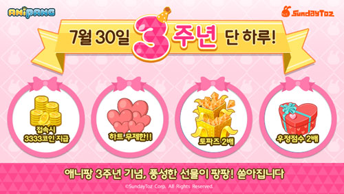 ¼±µ¥ÀÌÅäÁî(´ëÇ¥ ÀÌÁ¤¿õ, www.sundaytoz.com)°¡ '¾Ö´ÏÆÎ'ÀÇ Ãâ½Ã 3ÁÖ³âÀ» ±â³äÇÏ´Â ´Ù¾çÇÑ À̺¥Æ®¸¦ ÁøÇàÇÑ´Ù°í 30ÀÏ ¹àÇû´Ù.