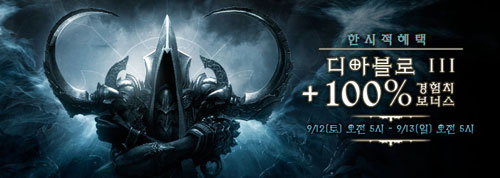 ¼ÒÇÁÆ®¿þ¾î °³¹ß ¹× ÆÛºí¸®½Ì ¾÷°èÀÇ ¼±µÎÁÖÀÚÀÎ ºí¸®ÀÚµå ¿£ÅÍÅ×ÀÎ¸ÕÆ®(Blizzard Entertainment, Inc. www.blizzard.com)´Â ÀÚ»çÀÇ ¾×¼Ç ·ÑÇ÷¹À× °ÔÀÓ µð¾Æºí·Î III(Diablo¢ç III)¿Í ±× È®ÀåÆÑ µð¾Æºí·Î III: ¿µÈ¥À» °ÅµÎ´Â ÀÚ(Diablo¢ç III: Reaper of Souls¢â, ÀÌÇÏ ¿µÈ¥À» °ÅµÎ´Â ÀÚ)ÀÇ PC ¹öÀü¿¡ 9¿ù 12ÀÏ(Åä) ¿ÀÀü 5½ÃºÎÅÍ 9¿ù13ÀÏ(ÀÏ) ¿ÀÀü 5½Ã±îÁö 24½Ã°£ µ¿¾È ¡®100% °æÇèÄ¡ º¸³Ê½º ÇýÅá¯À» Á¦°øÇÑ´Ù°í ¹àÇû´Ù.