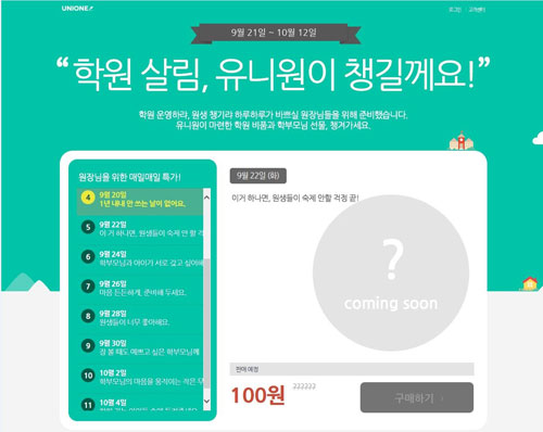 À̹ø À̺¥Æ®´Â 9¿ù 21ÀϺÎÅÍ 10¿ù 12ÀϱîÁö 3ÁÖ°£ ÁøÇàµÇ¸ç, ¸ÅÁÖ ¿ù¿äÀÏ, ¼ö¿äÀÏ, ±Ý¿äÀÏ ¿ÀÈÄ 2½Ã¿¡ µôÀ» ¿ÀÇÂ, A4¿ëÁö 2500¸Å, Á¾ÀÌÄÅ 8¹Ú½º µî Çпø ¿î¿µ¿¡ ÇÊ¿äÇÑ ¼Ò¸ðǰ°ú Çпø È«º¸¹°Ç°À» Á¤°¡¿¡ °ü°è¾øÀÌ ¸ðµÎ 100¿ø¿¡ ÇÑÁ¤¼ö·® ÆÇ¸ÅÇÑ´Ù. Âü¿©¸¦ ¿øÇÏ´Â Çпø »ç¾÷ÀÚ(ÇпøÀå)´Â À¯´Ï¿ø °¡ÀÔ ÈÄ À̺¥Æ® ÆäÀÌÁö(http://unione.payco.com/event/100won4u)¸¦ ÅëÇØ °¡´ÉÇϸç, 1ȸ¿¡ ÇÑÇØ ¼±Âø¼øÀ¸·Î ±¸¸ÅÇÒ ¼ö ÀÖ´Ù.