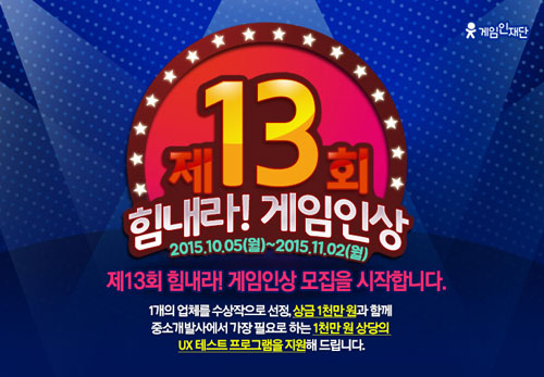 Àç´Ü¹ýÀÎ °ÔÀÓÀÎÀç´Ü(ÀÌ»çÀå ³²±ÃÈÆ)ÀÇ Áß¼Ò°³¹ß»ç Áö¿ø ÇÁ·Î±×·¥ <Èû³»¶ó! °ÔÀÓìÑ»ó> ÀÌ ¿À´Ã 5ÀÏ(¿ù)ºÎÅÍ Á¦ 13ȸÂ÷ Âü°¡ Á¢¼ö ¸ðÁýÀ» ½ÃÀÛÇÑ´Ù.
