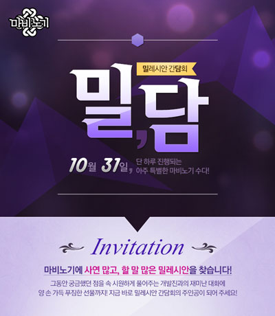 ¸¶ºñ³ë±â À¯Àú°£´ãȸ ¡®¹Ð´ã¡¯¿¡ ´ëÇÑ º¸´Ù ÀÚ¼¼ÇÑ ³»¿ëÀº ¸¶ºñ³ë±â °ø½Ä ȨÆäÀÌÁö(www.mabinogi.com)¿¡¼ È®ÀÎÇÒ ¼ö ÀÖ´Ù.