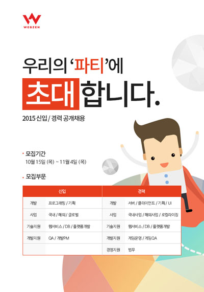 ¢ßÀ¥Á¨(´ëÇ¥ ±èÅ¿µ, http://company.webzen.com)ÀÌ ½Å±Ô ä¿ë»çÀÌÆ®¸¦ °³¼³Çϰí 2015³âµµ °æ·Â ¹× ½ÅÀÔ»ç¿øÀ» °ø°³ ä¿ëÇÑ´Ù.