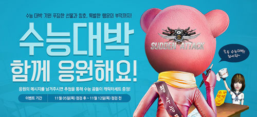 ¼µç¾îÅÿ¡¼´Â 12ÀϱîÁö Á¢¼Ó À¯Àú¿¡°Ô ¡®ÇÕ°Ý±â¿ø ÈÞÁö¡¯, ¡®ÄĽÎ(ÄÄÇ»ÅÍ ½ÎÀÎÆæ) ³ªÀÌÇÁ¡¯, ¡®¼ö´É ´ë¹Ú¡¯ ¿µ±¸ÄªÈ£, Çà¿îÀÇ ºÎÀû µî ¡®¼ö´É ´ë¹Ú ±â¿ø ¼±¹°¡¯À» ¸ðµÎ Áö±ÞÇϸç, À̺¥Æ® ÆäÀÌÁö¿¡ ¼ö´É ´ë¹Ú ÀÀ¿ø ´ñ±ÛÀ» ³²±â¸é Ãß÷À» ÅëÇØ 100¸í¿¡°Ô ¡®¼ö´É °õµ¹ÀÌ Ä³¸¯ÅÍ ¼¼Æ®¡¯ ¾ÆÀÌÅÛÀ» Á¦°øÇÑ´Ù. ¶ÇÇÑ, ¼ö´É ´çÀÏ Á¢¼ÓÇØ °ÔÀÓÀ» 1ȸ ÀÌ»ó Ç÷¹ÀÌÇÏ´Â À¯Àú¿¡°Ô´Â ¡®½ÃÇèÁö ¼ö·ùꡝ°ú ¡®AK47´«²É¡¯À» ¼±¹°Çϸç, 19ÀϱîÁö ¼ö´É Á¾·á¸¦ ±â³äÇØ ´õ¿í dz¼ºÇÑ ÇýÅÃÀ» ÁÖ´Â 2Â÷ À̺¥Æ®¸¦ Ãß°¡·Î ÁøÇàÇÑ´Ù.