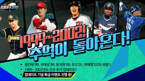 ¸¶Áö¸·À¸·Î, 'ÄÄÇÁ¾ß2015' ÆäÀ̽ººÏ(https://www.facebook.com/com2usprobaseball2015) À̺¥Æ® °Ô½Ã±Û¿¡ ´ñ±Û·Î ÀÚ½ÅÀÇ ±¸´Ü¸í°ú 99-02³âµµ ¼±¼ö ÀÎÁõ¼¦À» ¿Ã¸° ¸ðµç ÀÌ¿ëÀÚ¿¡°Ô '1999-2002 °í±Þ ¼±¼öÆÑ' 1ÀåÀ» Ãß°¡·Î Áö±ÞÇϸç, ¿À´Â 18ÀϱîÁö ¾÷µ¥ÀÌÆ® ±â³ä '1999-2002' ¼±¼öÆÑ ÆÇ¸ÅÇϰí KBO µå¸², ³ª´®ÆÑ µîÀÇ ¼±¼ö »Ì±â ¾ÆÀÌÅÛÀ» 40% ÇÒÀÎµÈ °¡°Ý¿¡ ¸¸³¯ ¼ö ÀÖ´Ù.