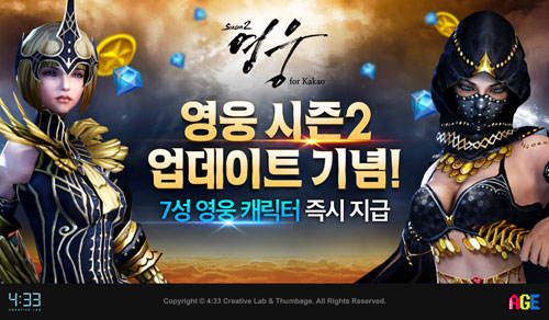¸ÕÀú 4:33Àº '¿µ¿õ for Kakao' ¼­ºñ½º 1ÁÖ³âÀ» ±â³äÇØ »õ·Ó°Ô Ãß°¡µÈ 12Á¾ÀÇ 7¼º ¿µ¿õµéÀ» ¸ðµç ÀÌ¿ëÀÚ¿¡°Ô Áö±ÞÇÑ´Ù. ¸ÕÀú 1ÁÖ³âÀÎ ¿À´ÃÀº ¸ðµç ÀÌ¿ëÀÚ¿¡°Ô 7¼º ¿µ¿õÀ» Áö±ÞÇϰí, ½Å±Ô, º¹±Í ÀÌ¿ëÀÚµéÀº °£´ÜÇÑ Ã⼮üũ¸¸À¸·Î 7¼º ¿µ¿õ »Ì±â±ÇÀ» Ãß°¡·Î ¼ö·ÉÇÒ ¼ö ÀÖÀ¸¸ç, ±âÁ¸ ¿µ¿õµéÀº Ưº° À̺¥Æ®¸¦ ÅëÇØ Ãß°¡ Áö±Þ¹ÞÀ» ¼ö ÀÖ´Ù.