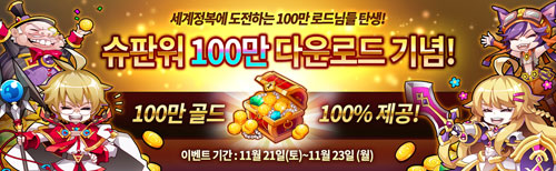 ³Ø½¼Àº ¡®½´ÆÛÆÇŸÁö¿ö¡¯ÀÇ ´©Àû ´Ù¿î·Îµå ¼ö 100¸¸ °Ç µ¹ÆÄ¸¦ ±â³äÇØ, 21ÀϺÎÅÍ 23ÀϱîÁö Á¢¼ÓÇÏ´Â ¸ðµç À¯Àú¿¡°Ô 100¸¸ ¡®°ñµå¡¯¸¦ ÁõÁ¤ÇÑ´Ù. ½Å±Ô À¯Àúµé¿¡°Ô´Â 100¸¸ ¡®°ñµå¡¯¿Í ÇÔ²² ¿©ÁÖÀΰø ¡®Å©¸®½º¡¯ ÄÚ½ºÆ¬°ú ÃÖ»ó±Þ ·¹Àüµå ¹«±â ¾ÆÀÌÅÛ, ¡®¼öÁ¤(°ÔÀÓ¸Ó´Ï)¡¯ µîÀ» ÇÔ²² Á¦°øÇÑ´Ù. ¶ÇÇÑ 22ÀϱîÁö Á¢¼ÓÇÏ´Â ¸ðµç À¯Àúµé¿¡°Ô´Â °í±Þ ¾ÆÀÌÅÛÀ» ¾òÀ» ¼ö ÀÖ´Â ¡®ºí·¢ ÄíÄí ĸ½¶¡¯ ¾ÆÀÌÅÛµµ ¼±¹°ÇÑ´Ù.