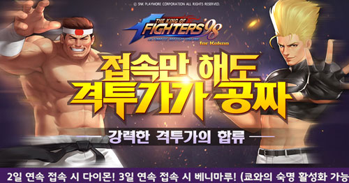 ¡®KOF'98 UM ONLINE for Kakao¡¯´Â Á¤½Ä Ãâ½Ã¸¦ ±â³äÇØ ¸ÅÀÏ Ãâ¼®ÇÏ´Â À¯Àúµé¿¡°Ô À¯¿ëÇÑ ÀΰÔÀÓ ¾ÆÀÌÅÛÀ» ÁõÁ¤Çϸç, ÀüüÀ¯Àú ÀüÅõ·Â ·©Å· 1À§¸¦ ´Þ¼ºÇÏ¸é °ÝÅõ°¡ ¡®¿À·ÎÄ¡¡¯¸¦ Áö±ÞÇÏ´Â À̺¥Æ®¸¦ ÁøÇàÇÑ´Ù.