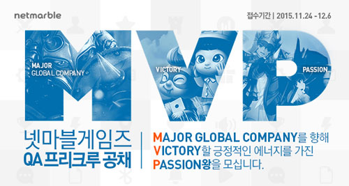 ³Ý¸¶ºí°ÔÀÓÁî(ÀÌÇÏ ³Ý¸¶ºí, ´ëÇ¥ ±Ç¿µ½Ä, www.netmarble.net)´Â °ÔÀÓÀÇ °Ë¼ö, °³¼±, ¸®½ºÅ© °ü¸®¸¦ Ã¥ÀÓÁö´Â ¡®QA(Quality Assurance, ǰÁúÇâ»ó) ÇÁ¸®Å©·ç¡¯ ÀÎÅÏÀ» 11¿ù 24ÀϺÎÅÍ 12¿ù 6ÀϱîÁö ¸ðÁýÇÑ´Ù.