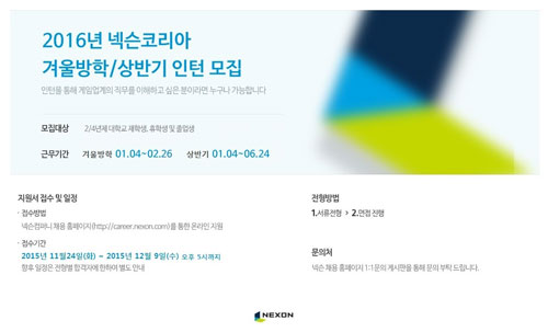 ³Ø½¼ÀÇ °Ü¿ï¹æÇÐ ¹× 2016³â »ó¹Ý±â ÀÎÅÏ»ç¿ø ä¿ë¿¡ °üÇÑ º¸´Ù ÀÚ¼¼ÇÑ ³»¿ëÀº ³Ø½¼ ÄÄÆÛ´Ï Ã¤¿ë ȨÆäÀÌÁö(http://career.nexon.com)¿¡¼­ È®ÀÎÇÒ ¼ö ÀÖ´Ù.