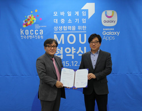 Çѱ¹ÄÜÅÙÃ÷ÁøÈï¿ø(KOCCA¡¤¿øÀå ¼Û¼º°¢)°ú »ï¼ºÀüÀÚ(Àü¹« À±´ë±Õ)´Â 1ÀÏ ±¹»ê ¿ì¼ö ¸ð¹ÙÀϰÔÀÓÀÇ ¹ß±¼, È«º¸, ÇØ¿ÜÁøÃ⠵ ´ëÇÑ Àû±Ø Áö¿øÀ» ÁÖ ³»¿ëÀ¸·Î ÇÏ´Â ¡®±¹³» ¸ð¹ÙÀϰÔÀÓ »ê¾÷ÀÇ Áö¼Ó ¼ºÀåÀ» À§ÇÑ ¾÷¹«Çù¾à¡¯À» °æ±âµµ ¼º³²½Ã ±Û·Î¹ú°ÔÀÓÇãºê¼¾ÅÍ¿¡¼ ü°áÇß´Ù.