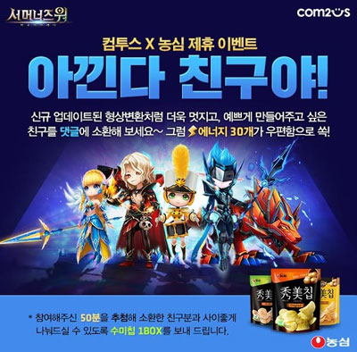 '¼¸Ó³ÊÁî ¿ö'¸¦ Ȱ¿ëÇÑ °øµ¿ ÇÁ·Î¸ð¼ÇÀº ³ó½É °ø½Ä ÆäÀ̽ººÏ(www.facebook.com/nongshim)¿¡¼ ¿À´Â 16ÀϱîÁö ÁøÇàµÇ¸ç, 17ÀϺÎÅÍ 20ÀϱîÁö '¼¸Ó³ÊÁî ¿ö' °ø½Ä ÆäÀ̽ººÏ(www.facebook.com/SummonersWar)¿¡¼ ¿¬ÀÌ¾î ½Ç½ÃµÈ´Ù. ÆäÀ̽ººÏÀÇ À̺¥Æ® °Ô½Ã±Û¿¡ Ä£±¸¸¦ ¼ÒȯÇÏ´Â ´ñ±ÛÀ» ´Þ¾Æ ³»¿ëÀ» °øÀ¯Çϸé, ´ç÷ÀÚ¿¡°Ô ÄÄÅõ½º Àα⠰ÔÀÓ ¡®¼¸Ó³ÊÁî ¿ö¡¯¿¡¼ »ç¿ëÇÒ ¼ö ÀÖ´Â ¾ÆÀÌÅÛ°ú ³ó½É ¼ö¹ÌĨ ¿À¸®Áö³ÎÀ» ¼±¹°·Î ÁõÁ¤ÇÑ´Ù.