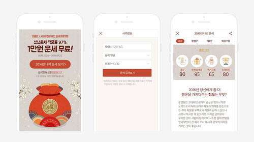 Âü¿© ¹æ¹ýÀº °£´ÜÇÏ´Ù. À̺¥Æ® ÆäÀÌÁö¿¡¼ ¡®2016³â ³ªÀÇ ¿î¼¼ º¸±â¡¯¸¦ Ŭ¸¯ÇÑ µÚ ÀÔ·Ââ¿¡ »ý³â¿ùÀϽø¦ ³ÖÀ¸¸é ¡ã2016³â ÃÑ¿îºÎÅÍ ¡ã¿ùº°¿î, ¡ãÀç¹°/¼º°ø, â¾÷/ÀÌÀü, °¡Á¤/»ç¶û, Çо÷/Ãâ¼¼, Áúº´/¼Ò¸Á µîÀÇ 5´ë¿î±îÁö ÇÑ ¹ø¿¡ È®ÀÎÇÒ ¼ö ÀÖ´Ù. ¡®¸ÞÀÏ·Î ¿î¼¼ º¸³»±â¡¯ ±â´ÉÀ» Ȱ¿ëÇØ ¼ö½Ã·Î ¿î¼¼ °á°ú¸¦ ²¨³»º¼ ¼ö ÀÖ¾î Æí¸®ÇÏ´Ù.