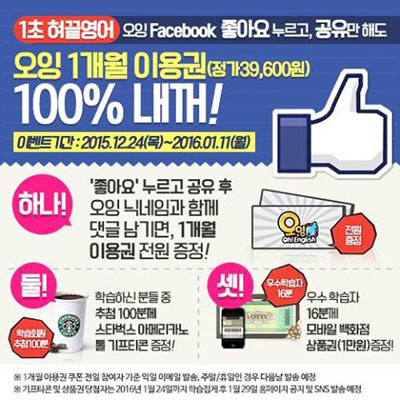 À̺¥Æ®¿¡ Âü¿©Çϱâ À§Çؼ´Â ¡®°ø½Ä ȨÆäÀÌÁö(www.new5ing.com)¡¯¿¡¼ ȸ¿ø°¡ÀÔ ÈÄ ¡®¿ÀÀ× ÆäÀ̽ººÏ ÆäÀÌÁö(www.facebook.com/ohenglish0509/)¡¯¿¡ Á¢¼ÓÇÑ ´ÙÀ½ ¡®ÁÁ¾Æ¿ä¡¯ ¹öưÀ» ´©¸£´Â °ÍÀ¸·Î ½ÃÀÛÇÒ ¼ö ÀÖ´Ù. ±× µÚ·Î °¡ÀÔÇÑ ¡®¿ÀÀ× ´Ð³×ÀÓ¡¯À¸·Î ´ñ±ÛÀ» ³²±â°í À̸¦ °øÀ¯ÇÏ¸é ¸ðµç ÀýÂ÷°¡ ¸¶¹«¸® µÈ´Ù. ÀÌ¿Í °°Àº °úÁ¤À» ¿Ï·áÇÑ È¸¿ø Àü¿ø¿¡°Ô´Â 1°³¿ù ÇÁ¸®¹Ì¾ö ÀÌ¿ë±ÇÀÌ ¹«»óÀ¸·Î Áö±ÞµÈ´Ù.