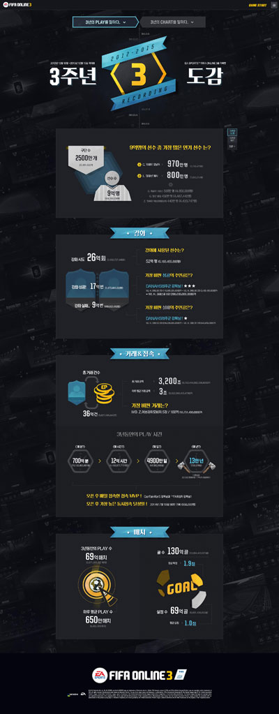 3Áֳ⠵µ°¨Àº ¡®FIFA ¿Â¶óÀÎ 3¡¯ Á¤½Ä Ãâ½ÃÀÏÀÎ 2012³â 12¿ù 18ÀϺÎÅÍ ¿ÃÇØ 12¿ù 15ÀϱîÁöÀÇ ¼ºñ½º ÇöȲÀ» ¼öÄ¡·Î ³ªÅ¸³½ ±â·Ï¹°·Î, Áö±Ý±îÁö »ý¼ºµÈ ±¸´Ü ¼ö, ¼±¼ö °Å·¡·®, Ç÷¹ÀÌ ½Ã°£ µî ´Ù¾çÇÑ ºÎºÐ¿¡¼ Èï¹Ì·Î¿î ±â·ÏµéÀ» ´ã°í ÀÖ´Ù.