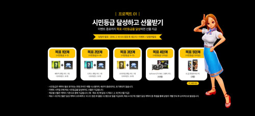 ù ¹øÂ° ÇÁ·ÎÁ§Æ®´Â ½Ã¹Îµî±Þ ´Þ¼ºÇϱâ´Ù. ½Ã¹Îµî±ÞÀ» 5´Ü°è·Î ³ª´©¾î¼ ¸ñÇ¥ ½Ã¹Îµî±Þ ´Þ¼º ½Ã, Â÷µîÀûÀ¸·Î ¼±¹°À» Áö±ÞÇϰí 4´Ü°è(½Ã¹Îµî±Þ 12 ÀÌ»ó)¿Í 5´Ü°è(½Ã¹Îµî±Þ 15 ÀÌ»ó)¸¦ ´Þ¼ºÇÑ Ä³¸¯ÅÍ Áß °¢°¢ 10¸í°ú 3¸íÀ» ¼±Á¤ÇØ GTX960 ±×·¡ÇÈÄ«µå¿Í ¡®¹®¸í ¿Â¶óÀΡ¯ PC¸¦ ÁõÁ¤ÇÑ´Ù. ½Ã¹Îµî±ÞÀº ij¸¯ÅÍ º°·Î À¯ÁöµÇ´Â ¡®¹®¸í ¿Â¶óÀΡ¯ÀÇ µ¶Ã¢ÀûÀÎ ·¹º§½Ã½ºÅÛÀ¸·Î ¼¼¼Ç Á¾·á ÈÄ¿¡µµ ÃʱâȵÇÁö ¾Ê´Â´Ù.