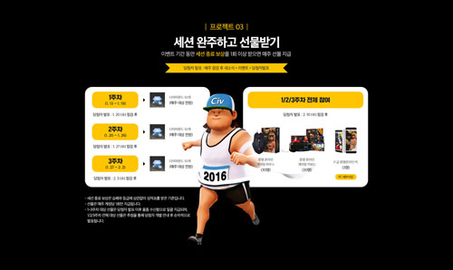 ¼¼ ¹øÂ° ÇÁ·ÎÁ§Æ®´Â ¼¼¼Ç ¿ÏÁÖÇϱâ·Î À̺¥Æ® ±â°£ µ¿¾È ¼¼¼Ç Á¾·á º¸»óÀ» 1ȸ ÀÌ»ó ¹ÞÀ¸¸é µÈ´Ù. ¸ÕÀú 1ÁÖÂ÷, 2ÁÖÂ÷, 3ÁÖÂ÷ Âü¿©ÀÚ Àü¿ø¿¡°Ô °ÔÀÓ ³» ÈÆóÀÎ ´ÙÀ̾Ƹóµå 50°³¸¦ ÁÖÂ÷º°·Î Áö±ÞÇÑ´Ù. 1/2/3ÁÖÂ÷¿¡ ¸ðµÎ Âü¿©ÇÑ ½Ã¹ÎµéÀ» ´ë»óÀ¸·Î 60¸íÀ» ¼±Á¤ÇÏ¿© 30¸í¾¿ ³ª´©¾î ¡®¹®¸í ¿Â¶óÀΡ¯ °ÔÀÌ¹Ö ¸¶¿ì½º¿Í °ÔÀÌ¹Ö Å°º¸µå¸¦ ÁõÁ¤Çϰí Çà¿îÀÇ 3¸í¿¡°Ô´Â °í»ç¾çÀÇ ¡®¹®¸í ¿Â¶óÀΡ¯ PC¸¦ Áö±ÞÇÑ´Ù.