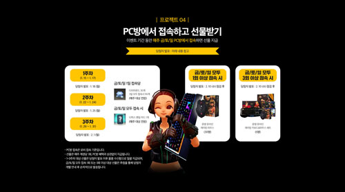 ¸¶Áö¸· ÇÁ·ÎÁ§Æ®´Â PC¹æ¿¡¼ Á¢¼ÓÇϱâ´Ù. À̺¥Æ® ±â°£ Áß ¸ÅÁÖ ±Ý,Åä,ÀÏ 3ÀÏ µ¿¾È PC¹æ¿¡¼ ¡®¹®¸í ¿Â¶óÀΡ¯¿¡ Á¢¼ÓÇÏ¸é °ÔÀÓ ³» ÈÆóÀÎ ´ÙÀ̾Ƹóµå¿Í ·£´ý Ä«µå¸¦ ÁõÁ¤ÇÑ´Ù. 1ÁÖ¶óµµ 3ÀÏ ¸ðµÎ PC¿¡¼ Á¢¼ÓÇÑ ½Ã¹Î 30¸í¿¡°Ô´Â ¹®¸í ¿Â¶óÀÎ °ÔÀÌ¹Ö ¸¶¿ì½º¸¦, 3ÁÖ°£ 3ÀÏ ¸ðµÎ Á¢¼ÓÇÑ ½Ã¹Î 5¸í¿¡°Ô´Â ¡®¹®¸í ¿Â¶óÀΡ¯ °ÔÀÌ¹Ö Å°º¸µå& ¸¶¿ì½º ¼¼Æ®¸¦ Ãß÷ÇÏ¿© ÁõÁ¤ÇÑ´Ù.
