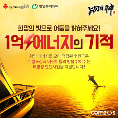 '1¾ï ¿¡³ÊÁöÀÇ ±âÀû'Àº Àü ¼¼°èÀÇ '³¬½ÃÀÇ ½Å' À¯ÀúµéÀÌ °ÔÀÓ Ç÷¹ÀÌ¿¡ »ç¿ëµÇ´Â ¿¡³ÊÁö¸¦ ¼Ò¸ðÇÒ ¶§ ¸¶´Ù ±â±ÝÀ» Àû¸³Çϰí, 1¾ï ¿¡³ÊÁö¸¦ ¸ðÀ¸´Â °øµ¿ ¸ñÇ¥¸¦ ´Þ¼ºÇϸé ÄÄÅõ½º°¡ Á¶¼ºÇÑ 1,000¸¸¿øÀÇ ÈÄ¿ø±ÝÀ» Àü´ÞÇÏ´Â ±Û·Î¹ú »çȸ°øÇå ÇÁ·ÎÁ§Æ®ÀÌ´Ù. À̹ø ÈÄ¿øÀº ¼¿ï »çȸº¹Áö°øµ¿¸ð±Ýȸ(¼¿ï »ç¶ûÀÇ¿¸Å)¿Í ¹Ð¾Ëº¹ÁöÀç´ÜÀÌ ÇÔ²²Çϸç, Àû¸³µÈ ÈÄ¿ø±ÝÀº Àü±â°¡ ºÎÁ·ÇÑ °³¹ßµµ»ó±¹¿¡ ž籤 ·£ÅÏÀ» Áö¿øÇÏ¿© ¾î¸°À̵éÀÇ ¹ãÀ» ¹àÇôÁÖ´Â '¶óÀÌÆÃÄ¥µå·±' Ä·ÆäÀο¡ »ç¿ëµÉ °èȹÀÌ´Ù.