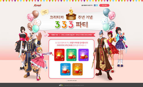 ¿Ã¿¥(www.allm.co.kr, ´ëÇ¥ ÀÌÁ¾¸í)Àº Àڻ簡 °³¹ßÇÏ°í ¼ºñ½ºÇÏ´Â ¡®Å©¸®Æ¼Ä« ¿Â¶óÀΡ¯¿¡¼ 2¿ù 25ÀÏ(¸ñ)ºÎÅÍ ¿À´Â 3¿ù 17ÀÏ(¸ñ)±îÁö ¼ºñ½º 3ÁÖ³âÀ» ±â³äÇÑ ¡®3-3-3 ÆÄƼ¡¯ À̺¥Æ®¸¦ ÁøÇàÇÑ´Ù°í ¹àÇû´Ù.