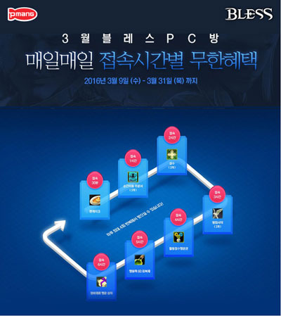À̹ø¿¡ »õ·Ó°Ô ½ÃÀ۵Ǵ PC¹æ À̺¥Æ®´Â 3¿ù 9ÀÏ(¼ö)ºÎÅÍ 31ÀÏ(¸ñ)±îÁö ÁøÇàµÈ´Ù. ¡®ºí·¹½º PC¹æ¡¯¿¡¼­ °ÔÀÓÀ» Ç÷¹ÀÌÇÏ¸é ¸Å ½Ã°£¸¶´Ù ¾ÆÀÌÅÛÀ» Áö±ÞÇÏ´Â ¹æ½ÄÀ̸ç, ½Ã°£Àº ³¯Â¥¿¡ »ó°ü¾øÀÌ ÃÖ´ë 6½Ã°£±îÁö ´©ÀûµÈ´Ù. 6½Ã°£ÀÌ Áö³­ ÀÌÈÄ¿¡´Â ½Ã°£ÀÌ ´Ù½Ã ¸®¼ÂµÇ¾î »õ·Ó°Ô ÇýÅÃÀ» ¹Þ°Ô µÈ´Ù.