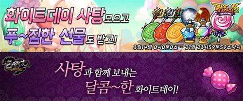 ÇÏÀ̺ê·Î(´ëÇ¥ ¿ø¼¼¿¬)´Â ÀÚ»çÀÇ Àα⠸ð¹ÙÀϰÔÀÓ 2Á¾¿¡¼­ Ưº° À̺¥Æ®¸¦ ½Ç½ÃÇÑ´Ù. 'µå·¡°ïºô¸®Áö2'´Â 3¿ù 14ÀÏ(¿ù)ºÎÅÍ 21ÀÏ(¿ù)±îÁö ÀÏÁÖÀÏ µ¿¾È 'È­ÀÌÆ®µ¥ÀÌ ¼±¹° À̺¥Æ®'¸¦ ÁøÇàÇÑ´Ù. À̺¥Æ® ±â°£ Áß Å½ÇèÀ» ÅëÇØ È­ÀÌÆ®µ¥ÀÌ »çÅÁÀ» ¸ðÀ¸¸é ¸ðÀº »çÅÁ °³¼ö¿¡ µû¶ó º¸³×¸£, ¾Æ´Ï¸¶, »÷ÁîÀÇ ºñ¾à µî °¢Á¾ ¾ÆÀÌÅÛÀ¸·Î ±³È¯ÇÒ ¼ö ÀÖ´Ù. '»ï±¹ÁöÃ¥·«Àü'Àº 3¿ù 12ÀÏ(Åä)ºÎÅÍ 14ÀÏ(¿ù)±îÁö '´ÞÄÞÇÑ »çÅÁÀ» ¸ð¾ÆÁÖ¼¼¿ä' À̺¥Æ®¸¦ ÁøÇàÇÑ´Ù. À̺¥Æ® ±â°£ Áß ÀϱâÅä ´ëÀüÀ» ÁøÇàÇÏ¸é ½Â¸®, ÆÐ¹è¿¡ »ó°ü¾øÀÌ ´ÞÄÞÇÑ »çÅÁ 1°³°¡ Áö±ÞµÇ¸ç, ´ÞÄÞÇÑ »çÅÁÀº ¸ðÀº °³¼ö¿¡ µû¶ó ¹é¿Á, ÀÚµ¿ ´ëÀü±Ç, °­È­±Ç µî°ú ±³È¯ÇÒ ¼ö ÀÖ´Ù.