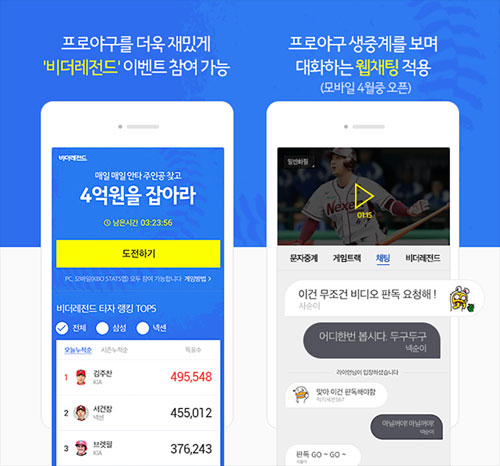 ¶ÇÇÑ ¾ß±¸ÆÒµéÀÌ ÇÁ·Î¾ß±¸¸¦ ´õ¿í Àç¹ÌÀÖ°Ô Áñ±æ ¼ö ÀÖµµ·Ï ¡®ºñ´õ·¹Àüµå¡¯ À̺¥Æ®µµ ÁøÇàÇÑ´Ù. ¡®ºñ´õ·¹Àüµå¡¯´Â ¾ÈŸ¸¦ Ä¥ °Í °°Àº ¼±¼ö¸¦ ÇÏ·ç¿¡ ÇÑ ¸í¾¿ ¿¹»óÇØ¼ ¸ÂÃß´Â À̺¥Æ®·Î, 50¹ø ¿¬¼ÓÀ¸·Î ÀûÁßÇÏ¸é »ó±ÝÀ» ¼ö¿©¹Þ°Ô µÈ´Ù. ÃÑ »ó±ÝÀº 4¾ï¿øÀ¸·Î ¹Ì¼Ç¿¡ ¼º°øÇÑ »ç¶÷ÀÌ º¹¼öÀÏ °æ¿ì¿¡´Â ±× ¼ö¿¡ µû¶ó »ó±ÝÀ» ³ª´²¼ Áö±Þ¹Þ´Â´Ù. ¡®ºñ´õ·¹Àüµå¡¯´Â 2014³â ½ÃÀÛµÈ ÀÌ ÈÄ ¾ß±¸ÆÒµéÀÇ Àα⸦ ²ø°í ÀÖ´Â À̺¥Æ®·Î ±×µ¿¾È KBO °ø½Ä ¾ÛÀ» ÅëÇØ¼¸¸ Âü¿© °¡´ÉÇßÀ¸³ª, À̹ø ½ÃÁðºÎÅÍ ´ÙÀ½ ½ºÆ÷Ã÷¿¡¼µµ Âü¿©ÇÒ ¼ö ÀÖµµ·Ï È®´ëµÆ´Ù. À̸¦ ÅëÇØ º¸±â¸¸ ÇÏ´Â ¾ß±¸¿¡¼ ¹þ¾î³ª °æ±â¸¦ ºÐ¼®Çϸç Á÷Á¢ KBO¸®±× °æ±â °á°ú¸¦ ¿¹ÃøÇÏ´Â Àç¹Ì¸¦ ´À³¥ ¼ö ÀÖÀ» °ÍÀ¸·Î ±â´ëµÈ´Ù.