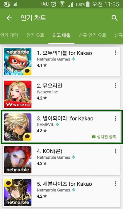°ÔÀÓºô(´ëÇ¥ ¼Ûº´ÁØ, www.gamevil.com)ÀÇ ¡®º°À̵Ǿî¶ó!¡¯°¡ ±¹³» ±¸±Û Ç÷¹ÀÌ¿¡¼µµ Àα⠱޻ó½Â ÁßÀÌ´Ù. ÀÌ °ÔÀÓÀº ±¹³» ¾ÖÇà ¾Û½ºÅä¾î Àα⿡ À̾î 14ÀÏ, ±¸±Û Ç÷¹ÀÌ¿¡¼µµ Àüü ¾Û ÃÖ°í ¸ÅÃâ 3À§¿¡ ¿À¸£¸é¼ ¼±µÎ¸¦ ¹Ù¦ Ãß°ÝÇϰí ÀÖ´Ù.