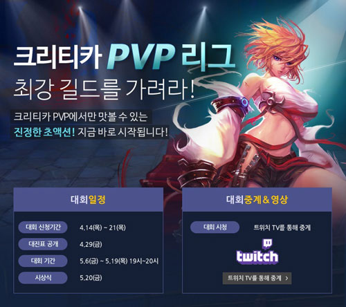 ¿Ã¿¥(www.allm.co.kr, ´ëÇ¥ ÀÌÁ¾¸í)Àº ÀÚ»çÀÇ ÃÊ¾×¼Ç RPG ¡®Å©¸®Æ¼Ä« ¿Â¶óÀΡ¯¿¡¼ ¿Â¶óÀÎ ±æµå ´ëÀüÀÎ ¡®PVP ÃÖ° ±æµå¸¦ °¡·Á¶ó¡¯ ½ÅûÁ¢¼ö¸¦ ½ÃÀÛÇß´Ù°í 15ÀÏ ¹àÇû´Ù.