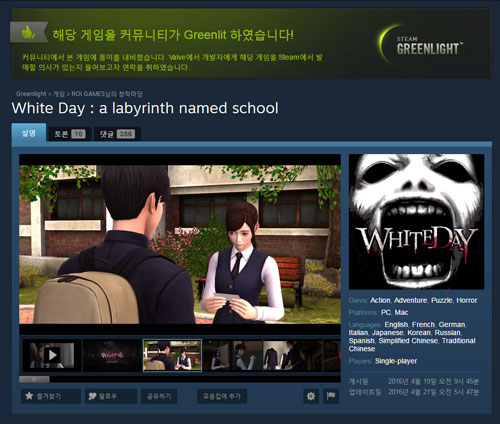 ¢ß·ÎÀ̰ÔÀÓÁî(´ëÇ¥: ÀÌ¿ø¼ú)´Â [ÈÀÌÆ®µ¥ÀÌ: Çб³¶ó´Â À̸§ÀÇ ¹Ì±Ã] (White Day: a labyrinth named school)ÀÌ 21ÀÏ ¿ÀÀü(Çѱ¹ ½Ã°¢), ½ºÆÀÀ¸·ÎºÎÅÍ ¡®Ãâ½Ã Çã°¡¡¯(Greenlit) µÇ¾ú´Ù°í ¹àÇû´Ù. Áö³ 19ÀÏ ½ºÆÀ ±×¸°¶óÀÌÆ® µî·Ï ¹× ÅõÇ¥ ½ÃÀÛ ÀÌÆ² ¸¸¿¡, ºü¸¥ ¼Óµµ·Î ´Þ¼ºÇÑ Äè°Å´Ù.