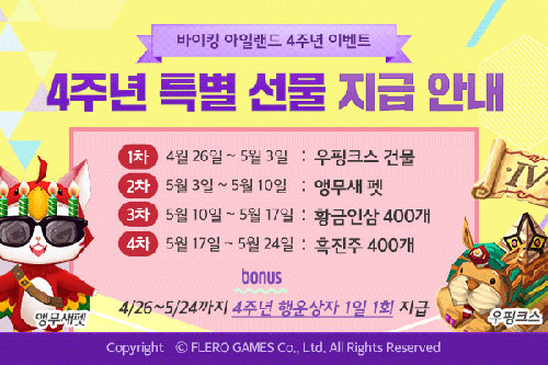 <¹ÙÀÌÅ· ¾ÆÀÏ·£µå> 4Áֳ⠱â³ä À̺¥Æ®¿¡ ´ëÇÑ º¸´Ù ÀÚ¼¼ÇÑ ³»¿ëÀº °ø½Ä ȨÆäÀÌÁö(http://weme.wemade.com/game/game_info.asp?GmCode=4)¿¡¼ È®ÀÎÇÒ ¼ö ÀÖ´Ù.