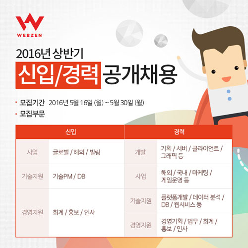 ¢ßÀ¥Á¨(´ëÇ¥ ±èÅ¿µ, http://company.webzen.com)ÀÌ 2016³â »ó¹Ý±â ½ÅÀÔ ¹× °æ·Â»ç¿øÀ» °ø°³ ä¿ëÇÑ´Ù.