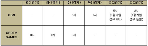 À̹ø ½ÃÁðºÎÅÍ´Â °ü¶÷°´ÀÇ ½Ãû ÆíÀÇ ¹× ÃÖ°í Ä÷¸®Æ¼ÀÇ °æ±â ÁøÇàÀ» À§ÇØ ¡®OGN¡¯°ú ¡®SPOTV GAMES¡¯ ¾ç ¹æ¼Û»ç°¡ ÇÔ²² Á߰踦 ¸Ã´Â´Ù. OGNÀº ¼ö¿äÀÏ Ã¹ ¹øÂ° °æ±â¿Í ¸ñ, ±Ý, Åä¿äÀϱîÁö ¸ÅÁÖ ÃÑ 6°æ±â¸¦, SPOTV GAMES´Â ¿ù, È¿äÀÏ °æ±â¿Í ¼ö¿äÀÏ µÎ ¹øÂ° °æ±â±îÁö ÁÖ¸¶´Ù 3°æ±â¸¦ ¹æ¼ÛÇÑ´Ù. SPOTV GAMES°¡ ¹æ¼ÛÇÏ´Â °æ±â´Â OGN¿¡¼µµ ¿Â¶óÀÎÀ» ÅëÇØ Áß°èÇÑ´Ù. ÇÑ °æ±â¾¿ ÁøÇàµÇ´Â ¿ù, È, ¸ñ¿äÀÏ °æ±â´Â ¿ÀÈÄ 8½Ã, µÎ °æ±â¾¿ ÁøÇàµÇ´Â ¼ö¿äÀϰú ±Ý¿äÀÏ¿¡´Â ¿ÀÈÄ 5½Ã(±Ý¿äÀÏ¿¡ ÇÑ °æ±â¸¸ ÀÖÀ» ½Ã ¿ÀÈÄ 8½Ã ½ÃÀÛ), Åä¿äÀÏ¿¡´Â ¿ÀÈÄ 2½Ã¿¡ °æ±â°¡ ½ÃÀÛÇÑ´Ù.