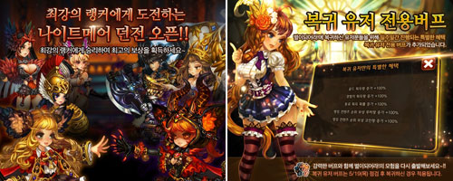 À̹ø ¾÷µ¥ÀÌÆ®¿¡¼­´Â ¾Æ·¹³ªÀÇ »óÀ§ ·©Ä¿¸¦ ´ë»óÀ¸·Î ÀüÅõ¸¦ ÁøÇàÇÏ´Â »õ·Î¿î ½ºÅ¸ÀÏÀÇ ´øÀü ¡®³ªÀÌÆ®¸Þ¾î¡¯°¡ ÃÖÃÊ °ø°³µÈ´Ù. »óÀ§ ·©Å· Ç÷¹À̾îÀÇ µ¦°ú ÀüÅõ¸¦ ¹úÀÌ´Â ¹æ½ÄÀ¸·Î ÁøÇàµÇ¸ç, ³­À̵µ¿¡ ¸Â´Â º¸»ó±îÁö ´õÇØÁ® ´õ¿í ¹ÚÁø°¨ ³ÑÄ¡´Â ÀüÅõ°¡ ÆîÃÄÁú Àü¸ÁÀÌ´Ù. ´õºÒ¾î »õ·Î¿î »óǰÀ¸·Î »õ ´ÜÀåÇÑ ÄÚÀÎ »óÁ¡°ú º¹±Í À¯ÀúµéÀ» À§ÇØ Æ¯º° ¹öÇÁ°¡ Àû¿ëµÇ´Â ¡®º¹±Í À¯Àú ¹öÇÁ ½Ã½ºÅÛ¡¯ÀÌ Ãß°¡µÈ´Ù.