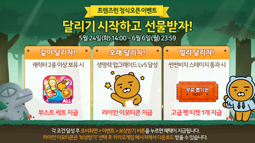 īī¿À´Â ³Ø½ºÆ®Ç÷ξî¿Í ÇÔ²² ÀÌ¿ëÀÚµéÀÇ ¼º¿ø¿¡ º¸´äÇϰíÀÚ ¡®ÇÁ·»Áî·± for Kakao¡¯ Á¤½Ä ¿ÀÇ ±â³ä Ưº° À̺¥Æ®¸¦ ÁøÇàÇÑ´Ù. ´ÙÀ½´Þ 6ÀϱîÁö ÁøÇàÇÏ´Â À̺¥Æ®¸¦ ÅëÇØ Çà»ç ±â°£µ¿¾È »ý¸í·Â ¾÷±×·¹À̵å 5·¹º§À» ´Þ¼ºÇÑ ÀÌ¿ëÀÚ Àü¿ø¿¡°Ô īī¿ÀÇÁ·»Áî Àαâ ij¸¯ÅÍÀÎ ¶óÀ̾ðÀÇ ½Å»ó À̸ðƼÄÜÀ» ÁõÁ¤ÇÑ´Ù. À̸ðƼÄÜÀº ÇØ´ç Á¶°Ç ´Þ¼ºÈÄ °ÔÀÓ³» ·Îºñȸé>À̺¥Æ®>º¸»ó¹Þ±â ¹öư ¼±Åà ÈÄ Ä«Ä«¿ÀÅåÀ¸·Î ¹ß¼ÛµÇ´Â °ÔÀÓ ¸Þ½ÃÁö¸¦ ÅëÇØ ´Ù¿î·Îµå ¹ÞÀ» ¼ö ÀÖ´Ù.