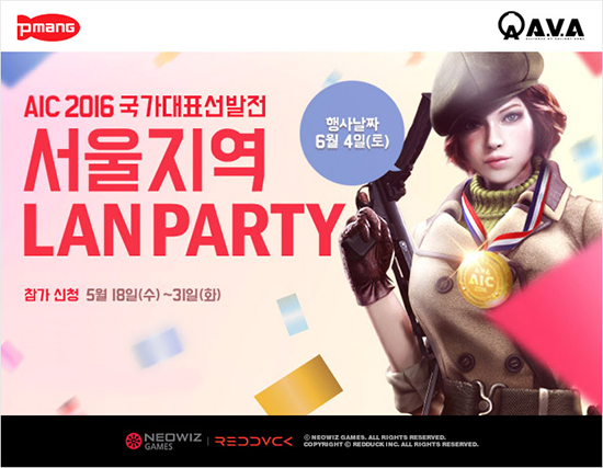 ³×¿ÀÀ§Áî°ÔÀÓÁî´Â °ÔÀÓÆ÷ÅÐ ÇǸÁÀÌ ¼ºñ½ºÇϰí, ·¹µå´öÀÌ °³¹ßÇÑ ¹Ð¸®Å͸® FPS °ÔÀÓ ¡®¾Æ¹Ù(A.V.A)¡¯°¡ ¿À´Â 4ÀÏ(Åä) ¼¿ïÁö¿ª ·£ ÆÄƼ(LAN PARTY)¸¦ °³ÃÖÇϰí, ÇöÀå¿¡¼ AIC 2016 ±¹°¡´ëÇ¥ ¼±¹ßÀüµµ ÇÔ²² ÁøÇàÇÒ ¿¹Á¤À̶ó°í 02ÀÏ ¹àÇû´Ù.
