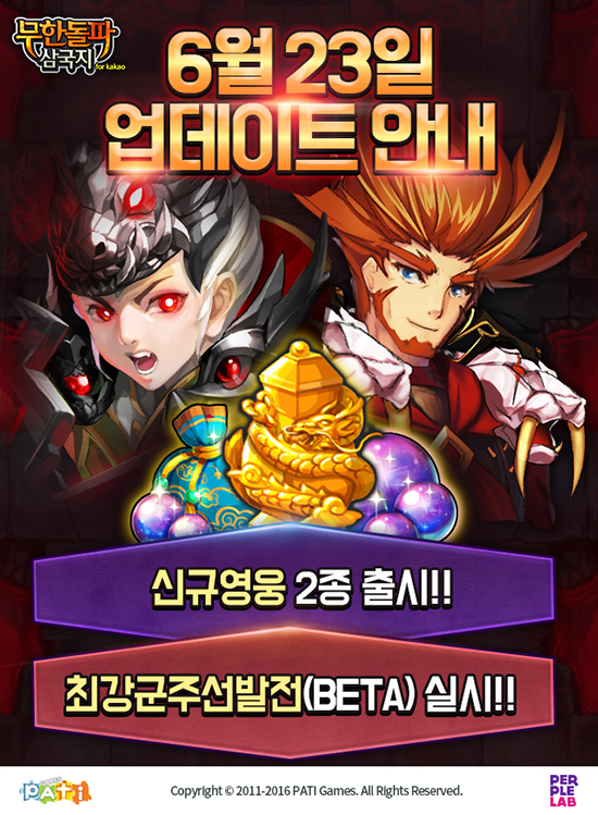 ÆÄƼ°ÔÀÓÁî´Â ÆÛÇ÷¦ÀÌ °³¹ßÇϰí Àڻ簡 ¼ºñ½ºÇÏ´Â ½´ÆÃ RPG ¡®¹«Çѵ¹ÆÄ»ï±¹Áö for Kakao¡¯¿¡ ½Å±Ô ¿µ¿õ 2Á¾À» Ãß°¡Çϰí, ÃÖ°±ºÁÖ ¼±¹ßÀüÀ» ½Ç½ÃÇÏ´Â µî ¾÷µ¥ÀÌÆ®¸¦ ÁøÇàÇÑ´Ù°í 23ÀÏ ¹àÇû´Ù. 23ÀÏ ¿ÀÀü 10½ÃºÎÅÍ ¸¸³¯ ¼ö ÀÖ´Â ½Å±Ô ¿µ¿õÀº ¿À³ª¶ó ¡®¼Õ°ß¡¯, Ã˳ª¶ó ¡®ºÐ³ëÀÇ À¯ºñ¡¯ 2Á¾ÀÌ´Ù. °ø°Ý ¹æ½ÄÀº 2Á¾ ¸ðµÎ ¿¬»çÇüÀ¸·Î, ºü¸¥ ¼Óµµ¸¦ °æÇèÇÒ ¼ö ÀÖ´Ù. ¡®¼Õ°ß¡¯ÀÇ °æ¿ì ÆÐ±â¸¦ ÁýÁßµÈ ÁöÁ¡¿¡ ¸ð¾Æ Àû¿¡°Ô 3360%ÀÇ µ¥¹ÌÁö ¹× 4Ãʰ£ ¾àȸ¦ À¯¹ßÇÏ´Â °ÍÀÌ Æ¯Â¡ÀÌ´Ù. ¡®ºÐ³ëÀÇ À¯ºñ¡¯´Â º¸º´ µ¹Áø ÇÊ»ì±â¸¦ °®°í ÀÖ¾î, 1120%ÀÇ µ¥¹ÌÁö 3ȸ¿Í 4Ãʰ£ ±âÀýÀ» À¯¹ßÇÑ´Ù. ÆÀ ´ëÀü ÀüÅõ ¹æ½ÄÀÇ Åä³Ê¸ÕÆ® ´ëȸ ¡®ÃÖ°±ºÁÖ ¼±¹ßÀü¡¯µµ ½Ç½ÃÇÑ´Ù. »ó´ë ±ºÁÖ¿Í 1:1 ´ë°áÀ» 3ȸ ÁøÇàÇØ ´õ ¸¹Àº ½Â¸®¸¦ ÇÑ ±ºÁÖ°¡ ´ÙÀ½ Åä³Ê¸ÕÆ®·Î ÁøÃâÇÏ´Â ½ÄÀÌ´Ù. ¿¹¼±¿¡¼ ±âÁ¸ÀÇ ÆÀ ´ëÀü ¼øÀ§¸¦ ±â¹ÝÀ¸·Î º»¼± ÁøÃâ ±ºÁÖ¸¦ ¼±¹ßÇϰí, ±× ÈÄ º»¼± 64°ºÎÅÍ °á½Â±îÁö ¼ø¼´ë·Î ÁøÇàµÈ´Ù. Åä³Ê¸ÕÆ® ¸®±×¿Í ¸®±× ´Ü°è ¼øÀ§º°·Î ¿©ÀÇÁÖ¿Í ¸í¼ºÀ» º¸»óÀ¸·Î Áö±ÞÇÒ ¿¹Á¤ÀÌ´Ù. ÆÄƼ°ÔÀÓÁî´Â ½Å±Ô ¿µ¿õ Ãâ½Ã¸¦ ±â³äÇØ 6¿ù 30ÀϱîÁö ¡®±ÝÈ»óÀÚ¡¯ 2¹è Àû¿ë°ú ÇÔ²² ¡®±¹°¡º¯È¯¡¯ ¹× ¡®¿µ¿õº¯È¯¡¯, ¡®Åõ±âÀå ÀÔÀå ¿©ÀÇÁÖ¡¯¸¦ °¢°¢ 50% ÇÒÀΰ¡¿¡ Á¦°øÇÑ´Ù. ½Â¸® Ƚ¼ö¿¡ µû¶ó ÃÖ´ë 1¸¸4õ ±ÝÈ, ½Å±Ô¿µ¿õÀÎ ¡®¼Õ°ß¡¯, ¡®ºÐ³ëÀÇ À¯ºñ¡¯ µîÀ» Á¦°øÇÏ´Â ¡®GM Ãʼ±À» À̰ܶ󡯵µ ÁøÇàÇÑ´Ù. ÀÌ¿Ü ¡®ÁÂÀÚ¡¯, ¡®»ç¸¶ÈÖ¡¯, ¡®7¼º À̺¥Æ® ¿µ¿õ ¼±Åñǡ¯ µîÀ» ¹ÞÀ» ¼ö ÀÖ´Â ¡®·¹¾î ¿µ¿õ »Ì±â È®Á¤ º¸»ó¡¯°ú ¡®¸» ¼ºÀå±Ç ÆÐŰÁö¡¯, ¡®ÁÂÀÚ+»ç¸¶ÈÖ ÆÐŰÁö¡¯¸¦ ¼±º¸ÀÌ´Â µî ´Ùä·Î¿î À̺¥Æ®¸¦ ½Ç½ÃÇÑ´Ù. ¡®¹«Çѵ¹ÆÄ»ï±¹Áö for Kakao¡¯ÀÇ ½Å±Ô ¿µ¿õ Ãß°¡ ¹× ÃÖ°±ºÁÖ ¼±¹ßÀü¿¡ ´ëÇÑ ÀÚ¼¼ÇÑ »çÇ×Àº °ø½Ä Ä«Æä(http://cafe.naver.com/mudolsamgook)¿Í °ø½Ä ÆäÀ̽ººÏ(https://www.facebook.com/mudolsamgook)¿¡¼ È®ÀÎ °¡´ÉÇÏ´Ù.