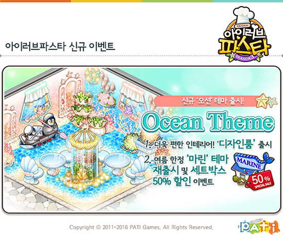 ÆÄƼ°ÔÀÓÁî´Â Àڻ簡 °³¹ß ¹× ¼ºñ½ºÇÏ´Â ·¹½ºÅä¶û °æ¿µ SNG ¡®¾ÆÀÌ·¯ºêÆÄ½ºÅ¸ for Kakao¡¯¿¡ ¿©¸§¸ÂÀÌ ¾÷µ¥ÀÌÆ®¸¦ ½Ç½ÃÇÏ°í ½Å±Ô ¡®¿À¼Ç Å׸¶¡¯¸¦ Ãâ½ÃÇÑ´Ù°í 23ÀÏ ¹àÇû´Ù. º»°ÝÀûÀÎ ¿©¸§ ½ÃÁðÀ» ¸Â¾Æ »õ·Ó°Ô ¼±º¸ÀÌ´Â ¡®¿À¼Ç Å׸¶¡¯´Â ½Ã¿øÇÑ ¹Ù´Ù°¡ ¿¬»óµÇ´Â ÀÎÅ׸®¾î ¾ÆÀÌÅÛÀ¸·Î, ¿À´Â 8¿ù ¸»±îÁö Lv5 ÀÌ»ó À¯Àú¸¦ ´ë»óÀ¸·Î ÇÑÁ¤ ÆÇ¸ÅÇÑ´Ù. È·ÁÇÑ »êÈ£ Àå½ÄÀÌ µ¸º¸ÀÌ´Â ¡®¿À¼Ç ÀÔ±¸¡¯¿Í ¡®¿À¼Ç À£ÄÄÀå½Ä¡¯, ¡®¿À¼Ç ¿ÜºÎ/½Ç³» ¼öÁ·°ü¡¯, ¡®¿À¼Ç Å×ÀÌºí¡¯ µî ÃÑ 8Á¾À̸ç, 7¿ù 20ÀϱîÁö 8Á¾À¸·Î ±¸¼ºµÈ ¼¼Æ®¹Ú½º¸¦ 40% Àú·ÅÇÏ°Ô ¼±º¸ÀδÙ. Áö³ ÇØ ¿©¸§ ÇÑÁ¤ Ãâ½ÃµÅ Àα⸦ ²ø¾ú´ø ¡®¸¶¸° Å׸¶¡¯µµ ÀçÃâ½ÃÇÑ´Ù. ¡®¸¶¸° ÀÔ±¸¡¯, ¡®¸¶¸° ÁöºØ¡¯ µîÀÇ ÀÎÅ׸®¾î ¾ÆÀÌÅÛÀ» 8¿ù±îÁö ±¸¸ÅÇÒ ¼ö ÀÖÀ¸¸ç, ¼¼Æ®¹Ú½º´Â 7¿ù 20ÀϱîÁö 50% ÇÒÀÎµÈ °¡°Ý¿¡ Á¦°øÇÑ´Ù. °¡°Ô ³» Ưº°ÇÑ °ø°£ ¸¶·Ã ¹× Æí¸®ÇÑ ÀÎÅ׸®¾î¸¦ À§ÇÑ ¡®µðÀÚÀÎ ·ë¡¯µµ ¼±º¸ÀδÙ. °¡°Ô ²Ù¹Ì±â¸¦ ¾î·Á¿öÇÏ´Â À¯Àúµé¿¡°Ô À¯¿ëÇÑ ÄÜÅÙÃ÷·Î, ¡®Æ¯º°»óÁ¡¡¯¿¡¼ ¿øÇÏ´Â µðÀÚÀÎ ¼±Åà ÈÄ ±¸¸Å °¡´ÉÇÏ´Ù. °¡°Ô ³» ÃÖ´ë 6*6 »çÀÌÁî·Î ¼³Ä¡ ÇÒ ¼ö ÀÖ´Ù. ¶ÇÇÑ À̹ø ¾÷µ¥ÀÌÆ®¿¡¼´Â Àç·á ¸¶ÄÏÀÎ ¡®»îÀº ´Þ°¿ ¸¶ÄÏ¡¯ÀÌ Ãß°¡µÆ´Ù. 51·¹º§ ´Þ¼º ½Ã Àç·á¸¶ÄÏÀÌ ¿ÀǵǸç Äù½ºÆ®¸¦ ¿Ï·áÇÏ¸é ¡®»îÀº ´Þ°¿ ¸¶ÄÏ¡¯ÀÌ Áö±ÞµÈ´Ù. ½ºÆä¼È ¸Þ´º·Î´Â ¡®½ºÄ«Ä¡ ¿¡±×¡¯°¡ Ãß°¡µÆ´Ù. ÀÌ¿Ü Á¢¼Ó ÈÄ °£´ÜÇÑ Äù½ºÆ®¸¸ ¿Ï·áÇØµµ ¡®S±Þ ¸Å´ÏÀú °í¿ë±Ç¡¯(7ÀÏ)ºÎÅÍ °¢Á¾ ¡®·°Å°¹Ú½º¡¯, ¡®Ä³½Ã¡¯±îÁö ´Ù¾çÇÑ º¸»óÀ» Áö±ÞÇÏ´Â ÁýÁß Ãâ¼® À̺¥Æ®¸¦ 7¿ù 6ÀϱîÁö ÁøÇàÇÑ´Ù. 1ÀÏÂ÷ºÎÅÍ 10ÀÏÂ÷±îÁö Äù½ºÆ® ¿Ï·á ½Ã 5õ °ñµå¿Í 500 °æÇèÄ¡¸¦ Ãß°¡ Áö±ÞÇϸç, 10ÀÏÂ÷¿¡´Â 5¸¸ °ñµå ¹× 5õ °æÇèÄ¡¸¦ Á¦°øÇÒ ¿¹Á¤ÀÌ´Ù. °°Àº ±â°£ ¡®»êÈ£À¯¸®Á¶¸í¡¯, ¡®¿´ë¾î ¿À¸£°ñ¡¯ µîÀÇ ¾ÆÀÌÅÛ°ú ±³È¯ °¡´ÉÇÑ ³¬½Ã À̺¥Æ®¿¡µµ Âü¿© °¡´ÉÇÏ´Ù. ¡®¾ÆÀÌ·¯ºêÆÄ½ºÅ¸ for Kakao'¿¡ ´ëÇÑ ÀÚ¼¼ÇÑ »çÇ×Àº °ÔÀÓ °ø½Ä Ä¿¹Â´ÏƼ(http://cafe.naver.com/ilovepastamo bile)¿¡¼ È®ÀÎ °¡´ÉÇÏ´Ù.