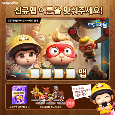 ³Ý¸¶ºí°ÔÀÓÁî(ÀÌÇÏ ³Ý¸¶ºí, ´ëÇ¥ ±Ç¿µ½Ä, www.netmarble.com)´Â '¸ðµÎÀǸ¶ºí for Kakao(ÀÌÇÏ, ¸ðµÎÀǸ¶ºí)¡¯ °ø½Ä ÆäÀ̽ººÏ(https://www.facebook.com/netmarblemoma)ÀÇ ½Å±Ô ¸Ê À̸§ ¸ÂÃß±â ÄûÁî À̺¥Æ®¸¦ ÅëÇØ 3Áֳ⠱â³ä ½Å±Ô¸Ê ¾÷µ¥ÀÌÆ®¸¦ ¿¹°íÇß´Ù.