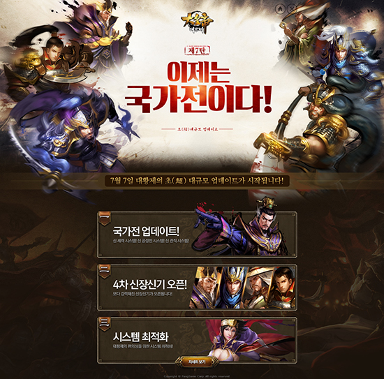 À¥Àü·« 1À§ °ÔÀÓ '´ëȲÁ¦'¿¡ '±¹°¡ ½Ã½ºÅÛ¡¯ÀÌ µµÀԵȴÙ. ±¹°¡¸¦ ¼¼¿ï ¼ö ÀÖÀ¸¹Ç·Î ¼¼·Â°ú °ø¼ºÀüÀÇ ±ÔÄ¢µµ ÀϺΠº¯°æµÇ´Â µî ¡®´ëȲÁ¦¡¯¿¡ ´ë°Ýº¯ÀÌ ÀϾÙ. ÆÎ°ÔÀÓÀº Àڻ簡 ¼ºñ½ºÁßÀÎ À¥Àü·«°ÔÀÓ '´ëȲÁ¦'¿¡¼ '±¹°¡Àü'°ú '4Â÷ ½ÅÀå½Å±â'°¡ Ãß°¡µÇ´Â ´ë°Ýº¯ 7ź '±¹°¡Àü'À» ¾÷µ¥ÀÌÆ®ÇÑ´Ù°í 7ÀÏ ¹àÇû´Ù. ´ëȲÁ¦ÀÇ '´ë°Ýº¯' ½Ã¸®Áî´Â ¼º¼÷±â¿¡ Á¢¾îµç '´ëȲÁ¦'¸¦ ´õ¿í »õ·Î¿î °ÔÀÓÀ¸·Î ¸¸µé±â À§ÇÑ ÇÁ·ÎÁ§Æ®·Î, ¸Åȸ À¯ÀúµéÀ» ¸¸Á·½Ãų ¼ö ÀÖ´Â ½Ã¸®Á ¼±º¸À̰í ÀÖ´Ù. À̹ø ¾÷µ¥ÀÌÆ®¿¡¼ °¡Àå ÁÖ¸ñÇÒ ¸¸ ÇÑ °ÍÀº '±¹°¡' ½Ã½ºÅÛÀ¸·Î, µµ¼ºÀ» 3°³ ÀÌ»ó Á¡·ÉÇÏ¸é ±¹°¡¸¦ °Ç¸³ÇÒ ¼ö ÀÖ´Ù. ¶Ç »õ·Ó°Ô Ãß°¡µÈ ¼öµµ ½Ã½ºÅÛÀº °ø¼ºÀü¿¡¼ Ư¼öÇÑ ¹öÇÁ¸¦ ¹ÞÀ» ¼ö ÀÖÁö¸¸ ¼öµµ¸¦ Á¡·É´çÇÏ¸é ±¹°¡´Â Áï½Ã ¸ê¸ÁÇϱ⠶§¹®¿¡ Àü·«ÀûÀÎ Ç÷¹À̰¡ ÇÊ¿äÇÏ´Ù. ±¹°¡´Â ÇÑ ¼¹ö´ç ÃÖ´ë 4°³±îÁö °Ç¸³ÇÒ ¼ö ÀÖ°í ±¹°¡´ç ÃÖ´ë 3°³ ¼¼·Â±îÁö °¡ÀÔÀÌ °¡´ÉÇÏ´Ù. ¶Ç '°üÁ÷' ½Ã½ºÅÛµµ Ãß°¡µÇ¾î °¡Àå ³ôÀº °è±ÞÀÎ 'ȲÁ¦'°¡ ¸ðµç ÀÚ¸®¸¦ Á÷Á¢ ÀÓ¸íÇÏ°Ô µÈ´Ù. ±¹°¡ ½Ã½ºÅÛ µµÀÔÀ¸·Î ±âÁ¸ÀÇ °ø¼ºÀü ±ÔÄ¢ÀÌ Å©°Ô ¹Ù²ï´Ù. ±¹°¡ ³» ¼¼·Â°£ ÀüÀå°øÀ¯¿Í, Á¦3ÀÚ °³ÀÔ °¡´É ºÎºÐÀÌ Ãß°¡µÆ´Ù. »ó´ë ¼¼·Â¿¡ ºñÇØ ÀüÅõ·ÂÀÌ ¹Ð¸±Áö¶óµµ ´Ù¸¥ ¼¼·Â°ú ÈûÀ» ÇÕÃÄ Çù°øÀ» ÆîÄ¡¸é Àü¼¼¸¦ µÚÁýÀ» ¼ö ÀÖ´Â 'Àü·«' ÀüÅõ°¡ °¡´ÉÇØÁø °ÍÀÌ´Ù. ÀüÅõ¸¦ µÚÁýÀ» ¼ö ÀÖ´Â ¶Ç ÇϳªÀÇ ½Ã½ºÅÛÀÌ ¼¼·ÂÀÇ '°è±Þ' ½Ã½ºÅÛÀÌ´Ù. ÃÑ 20´Ü°èÀÇ °è±ÞÀÌ Á¸ÀçÇÏ¸ç °è±Þº°·Î °ø¼ºÀü¿¡¼ »ó´çÇÑ Ãß°¡È¿°ú°¡ ¹ßÈֵȴÙ. ±¹°¡Àü ½Ã½ºÅÛ µµÀÔ ÈÄ¿¡´Â °¢ ¼¼·ÂµéÀÌ ¼ÒÀ¯ÇÑ ¼ºµéÀÌ ÃʱâȵȴÙ. ¿À¸®Áö³Î À§ÃË¿À »ï±¹ÁöÀÇ ´À³¦ÀÌ ³ª´Â Àüü ¸ÊÀ» ¹«´ë·Î, µ¿¸Í°ú ¹è½ÅÀÌ ³¹«ÇÏ´Â ³¼¼¿¡ ´©°¡ ÁøÁ¤ÇÑ ´ëȲÁ¦°¡ µÉ ¼ö ÀÖÀ» Áö, ´ëȲÁ¦ ´ë°Ýº¯ 7ź '±¹°¡Àü'¿¡ ¸¹Àº °ü½ÉÀÌ ½ò¸®°í ÀÖ´Ù. ÇÑÆí À̹ø ´ë±Ô¸ð ¾÷µ¥ÀÌÆ®¿¡¼´Â Á¶¿î°ú »ç¸¶ÀÇ, ¼¼, ´ÉÅë µî 4Â÷ ½ÅÀå½Å±â°¡ ¿ÀǵǾúÀ¸¸ç, Àå¼ö°¡ °¢¼ºÀ» ÇÏ¿© ¹«Àå±â(½ºÅ³)°¡ ÇÑÃþ ¾÷±×·¹À̵åµÈ´Ù. ÃÊ´ëÇü ¾÷µ¥ÀÌÆ®¿¡ °É¸ÂÀº ±½Á÷±½Á÷ÇÑ À̺¥Æ® 5Á¾µµ ÁغñµÆ´Ù. ½Å±Ô ÄÜÅÙÃ÷ÀÎ ¼¼·Â °è±ÞÀÇ 'È£ºÐ³¶Àå' ÀÌ»óÀ» ´Þ¼ºÇÏ¸é º¸»óǰÀ» Áö±ÞÇϰí, Á¡·Éµµ½Ã°¡ ¸¹Àº ±¹°¡ ¼øÀ¸·Î '¼¼·ÂÀÚ±Ý'À» Áö¿øÇÑ´Ù. ¶Ç ¸ÅÀÏ ´Ù¸¥ ¾ÆÀÌÅÛÀÌ ÇÒÀÎµÈ °¡°ÝÀ¸·Î Á¦°øµÇ¸ç, Ȳ±ÝÀ» ÅëÇØ ±¸ÀÔÀÌ °¡´ÉÇÏ´Ù. ÀÌ ¿Ü¿¡µµ ÃæÀü Ȳ±ÝÀÌ 2,500¾¿ ´Ã¾î³¯ ¶§¸¶´Ù ¼±Åà °¡´ÉÇÑ ¾ÆÀÌÅÛ ¼¼Æ®°¡ Áö±ÞµÇ°í, Ȳ±Ý ´©Àû ¼Òºñ·®¿¡ µû¶ó ½ÅÀå½Å±â¿Í ÁÖ±ºÀÇ ¼ºÀåÀ» µ¿½Ã¿¡ ÇÒ ¼ö ÀÖ´Â ¾ÆÀÌÅÛÀÌ Áö±ÞµÈ´Ù. »ï±¹ÁöÀÇ »õ·Î¿î ¿Ï¼ºÀ» º¸¿©ÁÙ ¡®´ëȲÁ¦¡¯ ´ë°Ýº¯ 7ź ¡®±¹°¡ ½Ã½ºÅÛ¡¯°ú À̺¥Æ®¿¡ ´ëÇÑ ³»¿ëÀº °ø½ÄȨÆäÀÌÁö(http://goo.gl/BN5fMO )¿¡¼ È®ÀÎÇÒ ¼ö ÀÖ´Ù.
