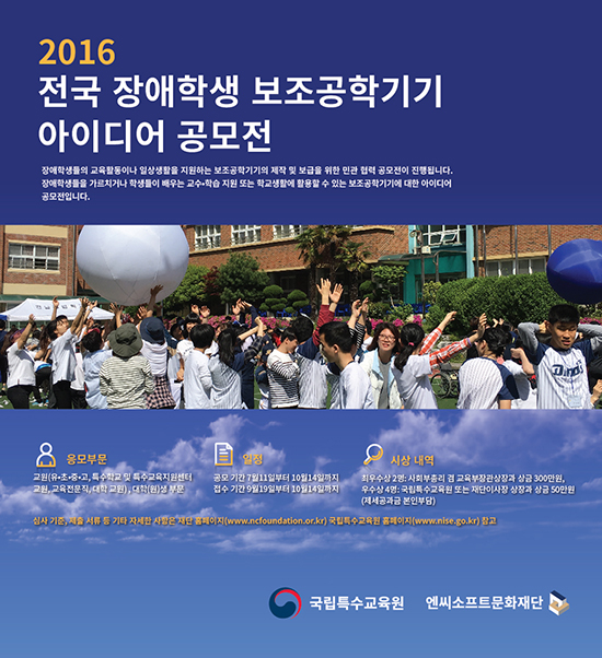 Àå¾ÖÇлýµéÀÇ ±³À°È°µ¿À̳ª ÀÏ»ó»ýȰÀ» Áö¿øÇÏ´Â º¸Á¶°øÇбâ±âÀÇ Á¦ÀÛ ¹× º¸±ÞÀ» À§ÇÑ ¹Î°ü °øµ¿ ÁÖÃÖ °ø¸ðÀüÀÌ ÁøÇàµÈ´Ù. ¿£¾¾¼ÒÇÁÆ®¹®ÈÀç´ÜÀº 11ÀÏ ±¹¸³Æ¯¼ö±³À°¿ø°ú °øµ¿À¸·Î ¡®2016 Àü±¹ Àå¾ÖÇлý º¸Á¶°øÇбâ±â ¾ÆÀ̵ð¾î °ø¸ðÀü¡¯À» °³ÃÖÇÑ´Ù°í ¹àÇû´Ù. Àå¾ÖÇлýµéÀ» °¡¸£Ä¡°Å³ª ÇлýµéÀÌ ¹è¿ì´Â ±³¼ö¡¤ÇнÀ Áö¿ø ¶Ç´Â Çб³»ýȰ¿¡ Ȱ¿ëÇÒ ¼ö ÀÖ´Â º¸Á¶°øÇбâ±â¿¡ ´ëÇÑ ¾ÆÀ̵ð¾î °ø¸ðÀüÀÌ´Ù. °ø¸ð ºÎ¹®Àº ±³¿ø(À¯¡¤ÃÊ¡¤Áß¡¤°í, Ư¼öÇб³ ¹× Ư¼ö±³À°Áö¿ø¼¾ÅÍ ±³¿ø, ±³À°Àü¹®Á÷, ´ëÇÐ ±³¿ø)°ú Çлý(´ëÇÐ ¹× ´ëÇпø»ý)À¸·Î ³ª´µ°í ºÎºÐº° ÃÖ¿ì¼ö»ó °¢ 1Àο¡°Ô´Â »çȸºÎÃѸ® °â ±³À°ºÎÀå°ü»ó°ú »ó±Ý 300¸¸¿øÀÌ ¼ö¿©µÈ´Ù. ¿ì¼ö»ó ÃÑ 4¸í¿¡°Ô´Â ±¹¸³Æ¯¼ö±³À°¿ø ¶Ç´Â Àç´ÜÀÌ»çÀå »óÀå°ú »ó±Ý 50¸¸¿øÀÌ ¼ö¿©µÈ´Ù.