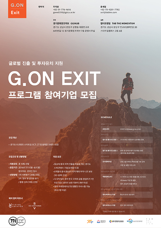 ¡®G.ON¡¯(www.g-on.or.kr)Àº °æ±âµµÀÇ ÄÜÅÙÃ÷ ºÐ¾ß ½ºÅ¸Æ®¾÷ Áö¿ø ÇÁ·Î±×·¥ ºê·£µå´Ù. ¡®G.ON¡¯Àº Ãʱ⠴ܰèÀÇ ½ºÅ¸Æ®¾÷À» Áö¿øÇÏ´Â ¡®G.ON Hatch¡¯¿Í ±Û·Î¹ú ÁøÃâÀ» ÁغñÇϰí ÀÖ´Â ¼ºÀå ´Ü°èÀÇ ½ºÅ¸Æ®¾÷À» Áö¿øÇÏ´Â ¡¯G.ON Exit¡®ÀÇ µÎ°¡Áö·Î ±¸¼ºµÇ¾î ÀÖ´Ù.