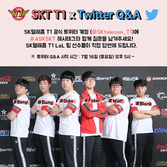 Æ®À§ÅÍ ÄÚ¸®¾Æ(Twitter Korea)´Â 16ÀÏ(Åä) ¿ÀÈÄ Àϻ꿡 À§Ä¡ÇÑ ¼±¼ö´Ü ¼÷¼Ò¿¡¼ SKÅÚ·¹ÄÞ ÇÁ·Î°ÔÀÓ´Ü T1 ¡®¸®±×¿Àºê·¹Àüµå(LoL)¡¯ ÆÀÀÇ ¶óÀ̺ê Q&A Çà»ç¸¦ ÁøÇàÇÑ´Ù°í ¹àÇû´Ù.. À̹ø Q&A´Â SKÅÚ·¹ÄÞ T1ÀÇ Æ®À§ÅÍ °ø½Ä °èÁ¤(twitter.com/sktelecom_t1)À» ÅëÇØ ¿À´Â 7¿ù 16ÀÏ ¿ÀÈÄ 5½ÃºÎÅÍ 1½Ã°£ µ¿¾È ÁøÇàµÇ¸ç, e½ºÆ÷Ã÷ÀÇ °£ÆÇ ½ºÅ¸ ¡®ÆäÀÌÄ¿(Faker)¡¯ ÀÌ»óÇõ, ¡®ÀÌÈ£¼º(Duke)¡¯, ¡®¹è¼º¿õ(Bengi)¡¯, ¡®°¼±±¸(Blank)¡¯, ¡®¹èÁؽÄ(Bang)¡¯, ¡®ÀÌÀç¿Ï(Wolf)¡¯ ¼±¼ö µî SKÅÚ·¹ÄÞ T1 ¸®±×¿Àºê·¹Àüµå ÆÀ Àü¿øÀÌ Âü°¡ÇØ ÆÒµéÀÇ Áú¹®¿¡ Á÷Á¢ ´äº¯ÇÒ ¿¹Á¤ÀÌ´Ù. À̹ø ¶óÀ̺ê Q&A¿¡ Âü¿©ÇÏ°í ½ÍÀº Æ®À§ÅÍ ÆÒÀº SKÅÚ·¹ÄÞ T1ÀÇ °ø½Ä Æ®À§ÅÍ °èÁ¤À» ¹æ¹®ÇÏ¸é ´©±¸³ª ½Ç½Ã°£À¸·Î ¿À°¡´Â Áú¹®°ú ´äº¯µéÀ» È®ÀÎÇÒ ¼ö ÀÖ°í, ÇØ½ÃÅÂ±× '#ASKSKT'¿Í ÇÔ²² Æò¼Ò ¼±¼öµé¿¡°Ô ±Ã±ÝÇß´ø Á¡µéÀ» ÀÚÀ¯·Ó°Ô Áú¹®ÇÒ ¼ö ÀÖ´Ù. ¶ÇÇÑ À̹ø Çà»ç´Â Æ®À§ÅÍÀÇ »ý¹æ¼Û ¾ÛÀÎ Æä¸®½ºÄÚÇÁ¸¦ ÅëÇØ¼µµ »ýÁß°è·Î ½ÃûÀÌ °¡´ÉÇÏ´Ù. SKÅÚ·¹ÄÞ T1 ¸®±×¿Àºê·¹Àüµå ÆÀ¿øµéÀº »ýÁß°è ¹æ¼Û¿¡¼ Æ®À°ú Æä¸®½ºÄÚÇÁ ´ñ±Û·Î ¿Ã¶ó¿À´Â Áú¹®µé¿¡ ±¸µÎ·Î ´äº¯ÇÒ ¿¹Á¤ÀÌ´Ù. ¹æ¼ÛÀÌ Á¾·áµÈ ÈÄ¿¡µµ ÆÒµé°ú ÁøÇàÇÑ Q&A ¿µ»óÀº º°µµ ¾Û ¼³Ä¡ ¾øÀÌ SKÅÚ·¹ÄÞ T1ÀÇ °ø½Ä Æ®À§ÅÍ(twitter.com/sktelecom_t1)¸¦ ¹æ¹®ÇÏ¸é ¾ðÁ¦µç ÀÚÀ¯·Ó°Ô ½ÃûÇÒ ¼ö ÀÖ´Ù. SKÅÚ·¹ÄÞ T1 ¸®±×¿Àºê·¹Àüµå ÆÀÀº ¶óÀ̾ù °ÔÀÓÁî°¡ °³¹ß ¹× ¹è±ÞÇÏ´Â ¼¼°èÀûÀÎ ¿Â¶óÀÎ °ÔÀÓ ¡®¸®±×¿Àºê·¹Àüµå¡¯ÀÇ ±Û·Î¹ú e½ºÆ÷Ã÷´ëȸÀÎ '¸®±×¿Àºê·¹Àüµå ¿ùµå èÇǾð½Ê'¿¡¼ 2ȸ ¿ì½ÂÇÑ Àü·ÂÀ» °®Ãá ¸í½Ç»óºÎ ¼¼°è ÃÖ°í ¼öÁØÀÇ ÆÀÀÌ´Ù. ƯÈ÷ 2013³â ÇÁ·Î·Î µ¥ºßÇÑ ¡®ÆäÀÌÄ¿¡¯ ÀÌ»óÇõ ¼±¼ö´Â ¼¼°è ´ëȸ¿¡¼ÀÇ È°¾àÀ» ¹ÙÅÁÀ¸·Î Æ®À§ÅÍ´Â ¹°·Ð Àü ¼¼°è '¸®±×¿Àºê·¹Àüµå' ÆÒµé¿¡°Ô °¡Àå ¸¹Àº »ç¶ûÀ» ¹Þ°í ÀÖ´Â ¼±¼ö´Ù.