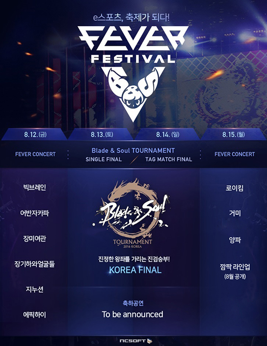 ¿£¾¾¼ÒÇÁÆ®´Â ºÎ»ê ÇØ¿î´ë¿¡¼ ÁøÇàÇÏ´Â ¡®Çǹö Æä½ºÆ¼¹ú(FEVER FESTIVAL)¡¯ÀÇ 1Â÷ ƼÄÏÀ» 7¿ù 25ÀÏ ÆÇ¸ÅÇÑ´Ù. Áö³ 21ÀÏ¿¡ ÆÇ¸ÅÇÑ ¡®¾ó¸®¹öµå¡¯ ¾çÀÏ(13ÀÏ/14ÀÏ)±Ç ƼÄÏÀº ÆÇ¸Å 20ºÐ¸¸¿¡ ¸ÅÁøµÆ´Ù. ¡®½Ì±ÛÀü¡¯°ú ¡®Å±׸ÅÄ¡¡¯ÀÇ ÃÖ°ÀÚ¸¦ °¡¸®´Â ¡®ºí·¹À̵å & ¼Ò¿ï(ÀÌÇÏ ºí¼Ò) Åä³Ê¸ÕÆ® KOREA FINAL¡¯¿¡ ´ëÇÑ ¶ß°Å¿î °ü½ÉÀ» ³ªÅ¸³Â´Ù. 25ÀÏ ÆÇ¸ÅÇϴ ƼÄÏÀº ¡®ºí¼Ò Åä³Ê¸ÕÆ® KOREA FINAL¡¯ ƼÄÏ 1Â÷¿Í Çǹö ÄܼƮ(FEVER CONSERT)¡¯ÀÌ´Ù. ¡®ºí¼Ò Åä³Ê¸ÕÆ® KOREA FINAL¡¯ 1Â÷ ƼÄÏÀº 8¿ù 13ÀÏ/14ÀÏ ´ÜÀÏ±Ç Æ¼ÄÏÀ¸·Î °¢ 1õ¸íÀÇ Á¼®À» ÆÇ¸ÅÇÑ´Ù. 25ÀÏ ¿ÀÈÄ 4½ÃºÎÅÍ ÀÎÅÍÆÄÅ©(http://ticket.interpark.com/Ticket/Goods/GoodsInfo.asp?GoodsCode=16008830) ¸¦ ÅëÇØ ±¸¸ÅÇÒ ¼ö ÀÖ´Ù. °¡°ÝÀº 2¸¸¿øÀÌ´Ù. ¡®Çǹö ÄܼƮ¡¯ ƼÄÏÀº 8¿ù 12ÀÏ/15ÀÏ ´ÜÀÏ±Ç Æ¼ÄÏÀ¸·Î ¡®ºí¼Ò Åä³Ê¸ÕÆ®¡¯ ƼÄϰú µ¿ÀÏÇÏ°Ô 25ÀÏ ¿ÀÈÄ 4½ÃºÎÅÍ ÀÎÅÍÆÄÅ©(http://ticket.interpark.com/Ticket/Goods/GoodsInfo.asp?GoodsCode=16008715)¸¦ ÅëÇØ ±¸¸ÅÇÒ ¼ö ÀÖ´Ù. ¡®ºí¼Ò Åä³Ê¸ÕÆ® KOREA FINAL¡¯ ÇöÀå °ü¶÷ ÇýÅõµ °ø°³µÈ´Ù. °ü¶÷ °í°´Àº 13ÀÏ¿¡´Â ¡®ºí¼Ò Åä³Ê¸ÕÆ® 2016¡¯ Àü¹Ý±â ¼±¹°ÀÎ ¡®¾Ù¸®½º¿Í ÀÌ»óÇÑ ³ª¶ó¡¯¿Í ¡®½Å±Ô ÀÇ»ó¡¯À», 14ÀÏ¿¡´Â 2016 ÈĹݱ⠼±¹°ÀÎ ¡®¸í¶û¡¯°ú ¡®½Å±Ô ÀÇ»ó¡¯À» ¹Þ´Â´Ù. ¾çÀÏ °ü¶÷ ½Ã¿¡´Â ¡®½Å±Ô ÀÇ»ó¡¯ ¿Ü ½Å±Ô 2Á¾ÀÇ ÀÇ»óÀ» Ãß°¡·Î ¹ÞÀ» ¼ö ÀÖ´Ù. 8¿ù 13ÀÏ/14ÀÏ ÇöÀåÀ» ãÀº °ü¶÷°´µéÀ» À§ÇØ ÃàÇϰø¿¬µµ ÆîÃÄÁø´Ù. ¡®Çǹö Æä½ºÆ¼¹ú¡¯Æ¼ÄÏÀ» ±¸ÀÔÇÑ °í°´Àº ¹«·á·Î °ü¶÷ÀÌ °¡´ÉÇÏ´Ù. ÃàÇϰø¿¬ÀÇ ¶óÀξ÷ÀÇ ÃßÈÄ ¡®Çǹö Æä½ºÆ¼¹ú¡¯ Ư¼³ ÆäÀÌÁö¸¦ ÅëÇØ ¾È³»ÇÒ ¿¹Á¤ÀÌ´Ù ¡®Çǹö Æä½ºÆ¼¹ú¡¯Àº ÇØ¿î´ë¿¡¼ ÆîÃÄÁö´Â ºí¼Ò e½ºÆ÷Ã÷¿Í ¹ÂÁ÷ ÄܼƮ¶ó´Â ÄÜÅÙÃ÷¸¦ ¿¬°áÇÑ »õ·Î¿î ÇüÅÂÀÇ ¿©¸§ ÃàÁ¦ÀÌ´Ù. ¿£¾¾¼ÒÇÁÆ®´Â ¿©¸§ ¼º¼ö±â¸¦ ¸Â¾Æ ÇØ¿î´ë¸¦ ãÀº ¼ö ¸¹Àº °ü°´µé¿¡°Ô ´Ùä·Î¿î ¹®È Çà»ç¸¦ ¼±º¸ÀÏ ¿¹Á¤ÀÌ´Ù. ¡®Çǹö Æä½ºÆ¼¹ú¡¯ÀÇ ÀÚ¼¼ÇÑ ³»¿ëÀº ºí¼Ò e½ºÆ÷Ã÷ ȨÆäÀÌÁö(http://bns.plaync.com/event/independent/p2016/160721_festival/main/index)¸¦ ÅëÇØ È®ÀÎÇÒ ¼ö ÀÖ´Ù.