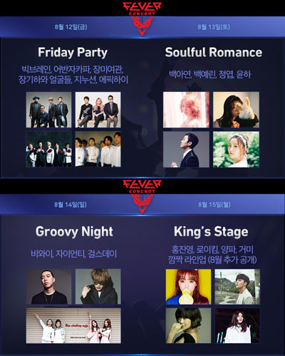 ¡ã12ÀÏ ÇÁ¶óÀ̵¥ÀÌ ÆÄƼ(Friday Party)¿¡´Â ºòºê·¹ÀÎ, ¾î¹ÝÀÚÄ«ÆÄ, Àå¹Ì¿©°ü, Àå±âÇÏ¿Í ¾ó±¼µé, Áö´©¼Ç, ¿¡ÇÈÇÏÀÌ ¡ã13ÀÏ ¡®¼Ò¿ïÇ® ·Î¸Ç½º(Soulful Romance)¡¯¿¡´Â ¹é¾Æ¿¬, ¹é¿¹¸°, Á¤¿±, À±ÇÏ ¡ã14ÀÏ ¡®±×·çºñ ³ªÀÌÆ®(Groovy Night)¡¯¿¡´Â °É½ºµ¥ÀÌ, ÀÚÀ̾ðƼ, ¡®¼î¹Ì´õ ¸Ó´Ï5¡¯ ¿ì½ÂÀÚ ºñ¿ÍÀÌ ¡ã15ÀÏ ¡®Å·½º ½ºÅ×ÀÌÁö(King¡¯s Stage)¡¯¿¡´Â °Å¹Ì, ¾çÆÄ, ·ÎÀÌÅ´ÀÌ ¹«´ë¿¡ ¿À¸¥´Ù. ¾ÆÁ÷ Á¤º¸¸¦ °ø°³ÇÏÁö ¾ÊÀº È÷µç ¾ÆÆ¼½ºÆ®ÀÇ °ø¿¬µµ ¿¹Á¤µÇ¾î ÀÖ´Ù.