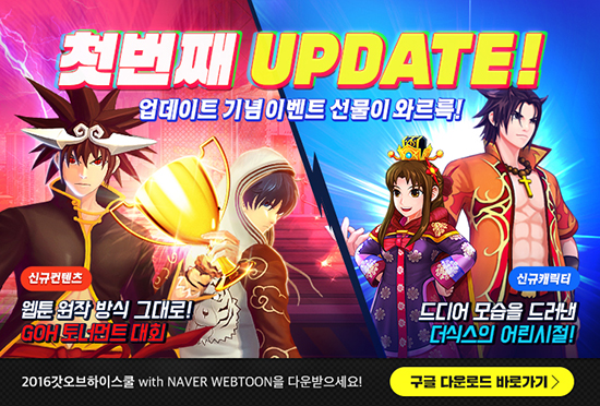 Ãâ½Ã ¿Èê ¸¸¿¡ ±¸±ÛÇ÷¹ÀÌ °ÔÀÓ ÃÖ°í ¸ÅÃâ 6À§¸¦ Â÷ÁöÇϸç ÃÊ¹Ý µ¹Ç³À» ÀÏÀ¸Å°°í ÀÖ´Â '2016°«¿ÀÇÏ'°¡ Åä³Ê¸ÕÆ® ½Ã½ºÅÛ°ú ½Å±Ô ij¸¯ÅÍ 2Á¾À» »õ·Ó°Ô ¼±º¸ÀÎ °Í. ¡®Åä³Ê¸ÕÆ® ½Ã½ºÅÛ¡¯Àº ¿ùµåÄŰú °°Àº ½ºÆ÷Ã÷ °æ±â¿¡¼ ÈçÈ÷ º¼ ¼ö ÀÖ´Â °ÍÀ¸·Î, °æ±â¸¦ °ÅµìÇÒ ¶§¸¶´Ù Áø ÆÀÀº Á¦¿ÜÇÏ¸é¼ ÀÌ±ä ÆÀ³¢¸®¸¸ °æÀïÇØ ÃÖÁ¾ÀûÀ¸·Î ³²Àº µÎ ÆÀÀÌ ¿ì½ÂÀ» °áÁ¤ÇÏ°Ô ÇÏ´Â ¸ðµå´Ù. À¥Å÷ ¡®°«¿ÀºêÇÏÀ̽ºÄð¡¯ÀÇ ´ëÀü ¹æ½Ä ¿ª½Ã Åä³Ê¸ÕÆ® °æ±â·Î ÁøÇàÇÑ´Ù´Â Á¡¿¡ Âø¾È, ¿øÀÛÀÇ ·êÀ» ±×´ë·Î °ÔÀÓ¿¡ Àû¿ëÇØ ±âÁ¸ÀÇ ¡®3:3 ÆÀ´ëÀü¡¯°ú 6¸í¾¿ ÆîÄ¡´Â ¡®GOH ¿µ¿õ´ëÀü¡¯°ú´Â ¶Ç ´Ù¸¥ Èï¹ÌÁøÁøÇÑ ´ë°áÀÌ °¡´ÉÇØÁ³´Ù. ¡®GOHÅä³Ê¸ÕÆ®¡¯·Î ¸í¸íµÈ À̹ø PvP(À¯Àú°£ ´ë°á) ¸ðµå´Â ÃÑ 30¶ó¿îµå·Î ÀÌ·ç¾îÁ®ÀÖ°í, 10¸íÀÇ Ä³¸¯Å͸¦ ¼±¹ßÇÒ ¼ö ÀÖ´Ù. °¢ ¶ó¿îµå¿¡¼´Â ³À̵µ°¡ ´Ù¸¥ 3°³ÀÇ »ó´ëÆÀ Áß 1ÆÀÀ» ¼±ÅÃÇÒ ¼ö ÀÖÀ¸¸ç, 10¸íÀÇ Âü¿©¼±¼ö°¡ ¸ðµÎ Å»¶ôÇÒ ¶§±îÁö °è¼Ó ÁøÇàµÈ´Ù. ¸ÅÀÏ GOHÅä³Ê¸ÕÆ®¸¦ ÁøÇàÇØ¼ ¾òÀº Æ÷ÀÎÆ®·Î ´ë±â ȸ鿡 ÀÖ´Â º¸¹°»óÀÚ¸¦ ±¸¸ÅÇÒ ¼ö ÀÖÀ¸¸ç, ´©Àû Æ÷ÀÎÆ®¿¡ µû¶ó ³ôÀº µî±ÞÀÇ º¸¹°»óÀÚ¸¦ ȹµæÇÒ ¼ö ÀÖ´Ù. »õ·Î¿î ij¸¯ÅÍ 2Á¾µµ Ãß°¡µÈ´Ù. ¿øÀÛ À¥Å÷¿¡¼ Áö±¸¸¦ Àå¾ÇÇϰíÀÚ ÇÏ´Â ³ì½º Áø¿µ¿¡ ¸Â¼± 6ÀÎÀÇ Àΰ£¹®ÈÀç ¡®´õ ½Ä½º¡¯ °¡¿îµ¥ ¹Ú¹«Áø°ú ¿õ³à°¡ °¢±â ÀþÀº ½ÃÀýÀÇ ¸ð½ÀÀÎ ¡®¾î¸° ¹Ú¹«Áø¡¯°ú ¡®ÀÛÀº ¿õ³à¡¯·Î ù µîÀåÇØ »ö´Ù¸¥ Àç¹Ì¸¦ ¼±»çÇÑ´Ù. ÇÑÆí, ù ¹øÂ° ¾÷µ¥ÀÌÆ®¸¦ ¸ÂÀÌÇØ 7Àϰ£ ¸ÅÀϸÅÀÏ ÇªÁüÇÑ ¾ÆÀÌÅÛÀ» ¸ðµç ÀÌ¿ëÀڵ鿡°Ô Áö±ÞÇϸç, 8¿ù 15ÀϱîÁö Á¢¼ÓÇÑ ¸ðµç ½Å±Ô ÀÌ¿ëÀÚ¿¡°Ô 2¸¸¿ø »ó´çÀÇ ÀΰÔÀÓ ¾ÆÀÌÅÛÀ» Ãß°¡·Î Á¦°øÇÑ´Ù. '2016°«¿ÀÇÏ'´Â ±¸±ÛÇ÷¹ÀÌ(http://hgurl.me/axb)¸¦ ÅëÇØ ´Ù¿î·Îµå °¡´ÉÇϸç, º¸´Ù ÀÚ¼¼ÇÑ °ÔÀÓ ³»¿ë ¹× À̺¥Æ®¿¡ °üÇØ¼´Â ³×À̹ö °ø½Ä Ä«Æä(http://cafe.naver.com/toastgoh)¿¡¼ È®ÀÎ °¡´ÉÇÏ´Ù.