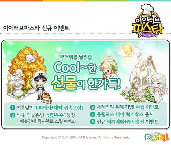ÆÄƼ°ÔÀÓÁî´Â Àڻ簡 °³¹ß ¹× ¼ºñ½ºÇÏ´Â ·¹½ºÅä¶û °æ¿µ SNG ¡®¾ÆÀÌ·¯ºêÆÄ½ºÅ¸ for Kakao¡¯°¡ 8¿ù ¼¼°èÀÎÀÇ ÃàÁ¦¿Í ±¤º¹ÀýÀ» ±â³äÇØ ´Ù¾çÇÑ À̺¥Æ®¿Í dz¼ºÇÑ ÇýÅÃÀ» Á¦°øÇÑ´Ù°í ¹àÇû´Ù. ¸ÕÀú ¿À´Â 17ÀϱîÁö ¼ºÈ¸¦ ¼öÁýÇØ ¾ÆÀÌÅÛÀ¸·Î ±³È¯ÇÏ´Â ¡®¼¼°èÀÎÀÇ ÃàÁ¦ À̺¥Æ®¡¯¸¦ ÁøÇàÇÑ´Ù. ÀΰÔÀÓ Ç÷¹À̸¦ ÅëÇØ ȹµæÇÑ ¼ºÈ¸¦ ¡®½ÅµéÀÇ °ø°£¡¯, ¡®È²±Ý »ç°ú³ª¹«¡¯, ¡®Æ÷¼¼À̵·ÀÇ Ã¢¡¯ µîÀÇ ·¹¾î ¾ÆÀÌÅÛ°ú ±³È¯ ¹ÞÀ» ¼ö ÀÖ´Ù. ÇØ´ç À̺¥Æ®´Â 8·¹º§ ÀÌ»óºÎÅÍ ÀÌ¿ë °¡´ÉÇÏ´Ù. 13ÀϺÎÅÍ 15ÀϱîÁö´Â ¡®±¤º¹Àý ±â³ä À̺¥Æ®¡¯¸¦ ¼±º¸ÀδÙ. ÇØ´ç ±â°£ Á¢¼ÓÇÏ´Â ¸ðµç À¯Àú¿¡°Ô ¡®´ó±â¸Ó¸® ¼Ò³à¡¯ ¾ÆÀÌÅÛÀ» Áö±ÞÇϸç, ƯÁ¤ Á¢¼Ó ½Ã°£¿¡ µû¶ó °æÇèÄ¡ 2¹è, ¿ÍÀÎ 2¹è, ÆÄ½ºÅ¸ ¼öÈ® ¹× ¿ä¸® ÆÇ¸Å ¼Óµµ 2¹èÀÇ Ç³¼ºÇÑ ¹öÇÁ¸¦ Á¦°øÇÑ´Ù. Áö³ ´Þ »õ·Ó°Ô ¼±º¸ÀÎ ¡®¿Ã¸²Æ÷½º Å׸¶¡¯ ·°Å°¹Ú½ºµµ Ãâ½ÃÇÑ´Ù. ·°Å°¹Ú½º ±¸¸Å ½Ã ·¹¾î ¾ÆÀÌÅÛÀÎ ¡®´ÞÀÇ ¿©½Å ¾Æ¹ÙŸ¡¯, ¡®¾Æ¸£Å׹̽ºÀÇ ¼ý»ç½¿¡¯ µîÀ» ·£´ýÀ¸·Î ȹµæ ÇÒ ¼ö ÀÖ´Ù. ¶ÇÇÑ ¸Þ´ºÆÇ¸Å Áï½Ã ¿Ï·á À̺¥Æ® ½ºÅ³À» °¡Áø ½Å±Ô ´Ü°ñ¼Õ´Ô ¡®½ÅÀÎÅõ¼ö¡¯¸¦ Ãß°¡Çß´Ù. ¡®½ÅÀÎÅõ¼ö¡¯´Â ·¹º§ 45 ÀÌ»óºÎÅÍ ¸¸³¯ ¼ö ÀÖ´Ù. ÀÌ¿Ü 8¿ù ¸»±îÁö ¿©¸§¸ÂÀÌ ÇÑÁ¤ Á¢¼Ó º¸»óÀ¸·Î ¡®S±Þ ¸Å´ÏÀú °í¿ë±Ç(7ÀÏ)¡¯, ¡®1¸¸ ÆÄ½ºÅ¸¡¯, ¡®100ij½Ã¡¯ µîÀ» Áö±ÞÇϸç, ¡®¿ø´õ·£µå ·°Å°¹Ú½º¡¯, ¡®7ij½Ã¡¯ µîÀ» Á¦°øÇÏ´Â ¿¬¼Ó Ãâ¼® À̺¥Æ®¸¦ ÁøÇàÇÑ´Ù. ij½Ã ÃæÀü ÇýÅÃÀ¸·Î ¡®Å¥ÇÇµå ·°Å°º£º£¡¯, ¡®¿ø´õ·£µå ¿ÍÀμ¿·¯¡¯¸¦ Áö±ÞÇϸç, ½Å±Ô °¡ÀÔÀÚ¿Í ÈÞ¸é º¹±Í À¯Àú¿¡°Ôµµ ij½Ã¿Í ·¹¾î ¾ÆÀÌÅÛÀ¸·Î ±¸¼ºµÈ ´Ù¾çÇÑ º¸»óÀ» Á¦°øÇÒ ¿¹Á¤ÀÌ´Ù. ¡®¾ÆÀÌ·¯ºêÆÄ½ºÅ¸ for Kakao'¿¡ ´ëÇÑ ÀÚ¼¼ÇÑ »çÇ×Àº °ÔÀÓ °ø½Ä Ä¿¹Â´ÏƼ(http://cafe.naver.com/ilovepastamo bile)¿¡¼ È®ÀÎ °¡´ÉÇÏ´Ù.