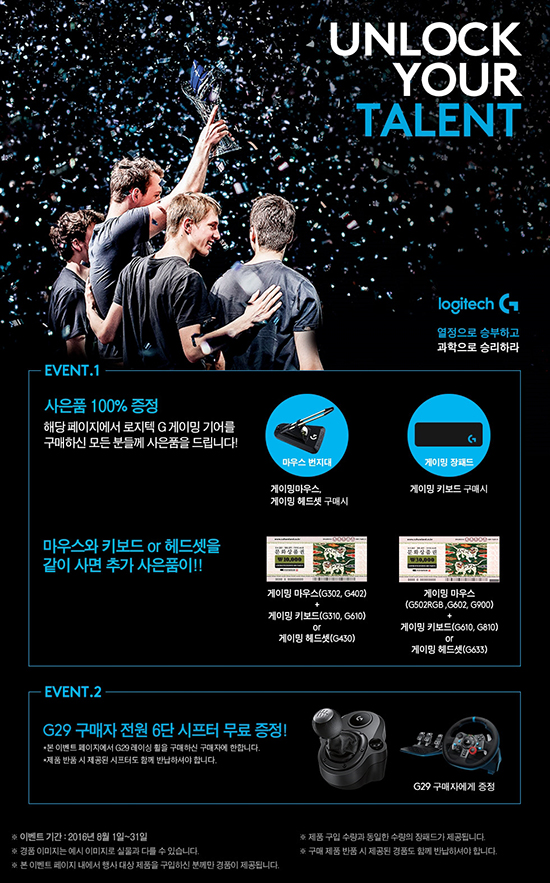 °³Àοë ÁÖº¯±â±â Àü¹®±â¾÷ ·ÎÁöÅØ ÄÚ¸®¾Æ(Áö»çÀå Á¤Ã¶±³)´Â ¿©¸§¹æÇÐÀ» ¸Â¾Æ ·ÎÁöÅØ G °ÔÀÌ¹Ö ±â¾î ±¸¸ÅÀÚ ¸ðµÎ¿¡°Ô »çÀºÇ°À» ÁõÁ¤ÇÏ´Â ¡®UNLOCK YOUR TALENT¡¯ °ÔÀÌ¹Ö ±â¾î ÇÁ·Î¸ð¼ÇÀ» ÁøÇàÇÑ´Ù. ¿À´Â 31ÀϱîÁö ÁøÇàµÇ´Â À̹ø ÇÁ·Î¸ð¼ÇÀº ÁÖ¿ä ¿Â¶óÀÎ ¿ÀǸ¶ÄÏ(11¹ø°¡, G¸¶ÄÏ, ¿Á¼Ç, ÀÎÅÍÆÄÅ©)¿¡¼ ÁøÇàµÇ¸ç, °ÔÀÌ¹Ö ¸¶¿ì½º(G302, G402, G502 RGB, G900) ¶Ç´Â °ÔÀÌ¹Ö Çìµå¼Â(G430, G633) ±¸¸ÅÀÚ Àü¿ø¿¡°Ô ¸¶¿ì½º ¹øÁö´ë¸¦, °ÔÀÌ¹Ö Å°º¸µå(G310, G610, G810) ±¸¸ÅÀÚ¿¡°Ô´Â °ÔÀÌ¹Ö ÀåÆÐµå¸¦ ÁõÁ¤ÇÑ´Ù. °ÔÀÌ¹Ö ¸¶¿ì½º¿Í ÇÔ²² °ÔÀÌ¹Ö Å°º¸µå ¶Ç´Â °ÔÀÌ¹Ö Çìµå¼ÂÀ» ±¸¸ÅÇϸé Ãß°¡·Î ¹®È»óǰ±Ç(1¸¸¿ø±Ç, 3¸¸¿ø±Ç)µµ ÁõÁ¤ÇÑ´Ù. ¶ÇÇÑ G29 µå¶óÀ̺ù Æ÷½º ·¹ÀÌ½Ì ÈÙ ±¸¸ÅÀÚ Àü¿ø¿¡°Ô´Â G29¿Í ÇÔ²² »ç¿ëÇÒ ¼ö ÀÖ´Â 6´Ü ½ÃÇÁÅ͸¦ ÁõÁ¤ÇÑ´Ù. ·ÎÁöÅØ G °ÔÀÌ¹Ö ±â¾î´Â ·ÎÁöÅØÀÇ µ¶ÀÚÀûÀÎ ±â¼úÀÌ ÀÀÁýµÈ ÇÏÀÌ¿£µå °ÔÀÌ¹Ö Á¦Ç°. °Ý·ÄÇÑ ¾×¼ÇÀ» À§ÇÑ °ÔÀÌ¹Ö ¸¶¿ì½º, ¼±¸íÇÑ Åë½ÅÀÇ °ÔÀÌ¹Ö Çìµå¼Â, ¿Ïº®ÇÑ ¼³°è¸¦ °®Ãá °ÔÀÌ¹Ö Å°º¸µå ±×¸®°í ÃÖÀûÀÇ Ç÷¹À̸¦ À§ÇÑ ·¹ÀÌ½Ì ÈÙ µîÀ¸·Î ±¸¼ºµÇ¾î ÀÖ´Ù. ·ÎÁöÅØ ÄÚ¸®¾Æ Á¤Ã¶±³ Áö»çÀåÀº ¡°°ÔÀÓ ¼º¼ö±âÀÎ ¿©¸§¹æÇÐÀ» ¸Â¾Æ Â¥¸´ÇÑ ½Â¸®¸¦ ¿øÇÏ´Â °ÔÀ̸ӵéÀ» À§ÇØ À̹ø ÇÁ·Î¸ð¼ÇÀ» ÁغñÇß´Ù¡±¸ç ¡°·ÎÁöÅØÀÇ ÃÖ»óÀÇ ±â¼úÀÌ Á¢¸ñµÈ °ÔÀÌ¹Ö ±â¾î¿Í ÇÔ²² Ç÷¹À̸¦ Áñ±â¸ç ÃÖ°íÀÇ °ÔÀÓ ¼ºÀûÀ» ´Þ¼ºÇϽñ⸦ ¹Ù¶õ´Ù¡±°í ¸»Çß´Ù. ÇÁ·Î¸ð¼Ç Á¦Ç°¿¡ ´ëÇÑ º¸´Ù ÀÚ¼¼ÇÑ Á¤º¸´Â ·ÎÁöÅØ ȨÆäÀÌÁö¿¡¼ È®ÀÎÇÒ ¼ö ÀÖ´Ù.