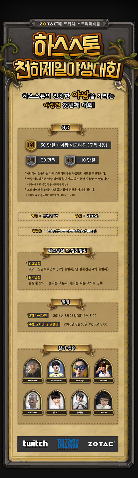 Á¶ÅØÄÚ¸®¾Æ(ZOTAC Korea¿¡¼´Â Àα⠰ÔÀÓ ½ºÆ®¸®¸Ó¿Í ÇÔ²² ´Ù¾çÇÑ °ÔÀÓ ¹èƲÀ» ¹úÀÌ´Â ¡®½ºÆ®¸®¸Ó ¹èƲ¡¯À» Æ®À§Ä¡ ÁêÆÒ´õ TV¿¡¼ ÁøÇàÇÑ´Ù°í 8¿ù 22ÀÏ ¹àÇû´Ù. Æ®À§Ä¡ÀÇ Àα⠽ºÆ®¸®¸Ó ¡®ÁêÆÒ´õ¡¯ÀÇ ÁøÇàÀ¸·Î ÆîÃÄÁö´Â ¡®Á¶ÅØ¹è ½ºÆ®¸®¸Ó ¹èƲ¡¯Àº ÃÑ »ó±Ý 100¸¸¿ø±Ô¸ðÀÇ ¸Å ´Þ ´Ù¾çÇÑ ÄÁ¼ÁÀÇ °ÔÀÓÀ» Àα⠰ÔÀÓ ½ºÆ®¸®¸Ó¿Í ÇÔ²² Åä³Ê¸ÕÆ® Çü½ÄÀ¸·Î ¿ì½ÂÀÚ¸¦ °¡¸®´Â ½ºÆ®¸®¸Ó¿ë ¸®±×ÀÌ´Ù. 1ȸÂ÷·Î ÁøÇàµÇ´Â ¡®ÇϽº½ºÅæ õÇÏÁ¦ÀϾ߻ý´ëȸ¡¯´Â ÇϽº½ºÅæÀÇ ÁøÁ¤ÇÑ ¾ß¿ÕÀ» °¡¸®´Â ¾ß»ýÀüÀÇ Ã¹¹øÂ° ´ëȸÀÌ´Ù. º» ´ëȸ´Â 8° ½Ì±Û Åä³Ê¸ÕÆ® ¹æ½ÄÀ¸·Î ÁøÇàµÇ¸ç, ½ÂÀÚ´Â µ¦À» À¯ÁöÇÏ°í ÆÐÀÚ´Â ´Ù¸¥ µ¦À¸·Î ÁøÇàÇÏ´Â ¿ÃųÁ¦ ¹æ½ÄÀ» äÅÃÇß´Ù. 1À§¿¡°Ô´Â 50¸¸¿øÀÇ »ó±Ý°ú ¾ß¿Õ À̸ðƼÄÜÀ», 2À§¿¡°Ô´Â 30¸¸¿øÀÇ »ó±Ý, 4°¿¡´Â 10¸¸¿øÀÇ »ó±ÝÀÌ Áö±ÞµÈ´Ù. ¡®ÇϽº½ºÅæ õÇÏÁ¦ÀϾ߻ý´ëȸ¡¯ÀÇ 8° 1Â÷~4Â÷ÀüÀº 8¿ù 23ÀÏ ¿ÀÈÄ 8½Ã¿¡, 4° 1,2Â÷Àü°ú °á½ÂÀüÀº 8¿ù 23ÀÏ ¿ÀÈÄ 8½Ã¿¡ ÁêÆÒ´õ TV(http://www.twitch.tv/sung0)¿¡¼ »ý¹æ¼Û µÇ¸ç, À̹ø ´ëȸ¿¡´Â Palmblad, Surrender, kodulgi, Lucete, looksam, °«º¸±â, °øÇõÁØ, ¸¶½ºÄ«°¡ Âü°¡ÇÏ°Ô µÇ¾î Å« ±â´ë¸¦ ¸ðÀ¸°í ÀÖ´Ù. Á¶ÅØÄÚ¸®¾Æ°¡ ÈÄ¿øÇϰí ÁêÆÒ´õTV °¡ ÁøÇàÇÏ´Â ¡®Æ®À§Ä¡ ½ºÆ®¸®¸Ó ¹èƲ¡¯Àº 1Â÷ ´ëȸ ÀÌÈÄ¿¡µµ ´Ù¼öÀÇ ½ºÆ®¸®¸Ó¿Í ÇÔ²² Áö¼ÓÀûÀ¸·Î Àα⠰ÔÀÓ ¹èƲÀ» ÁøÇà ÇÒ ¿¹Á¤ÀÌ´Ù.