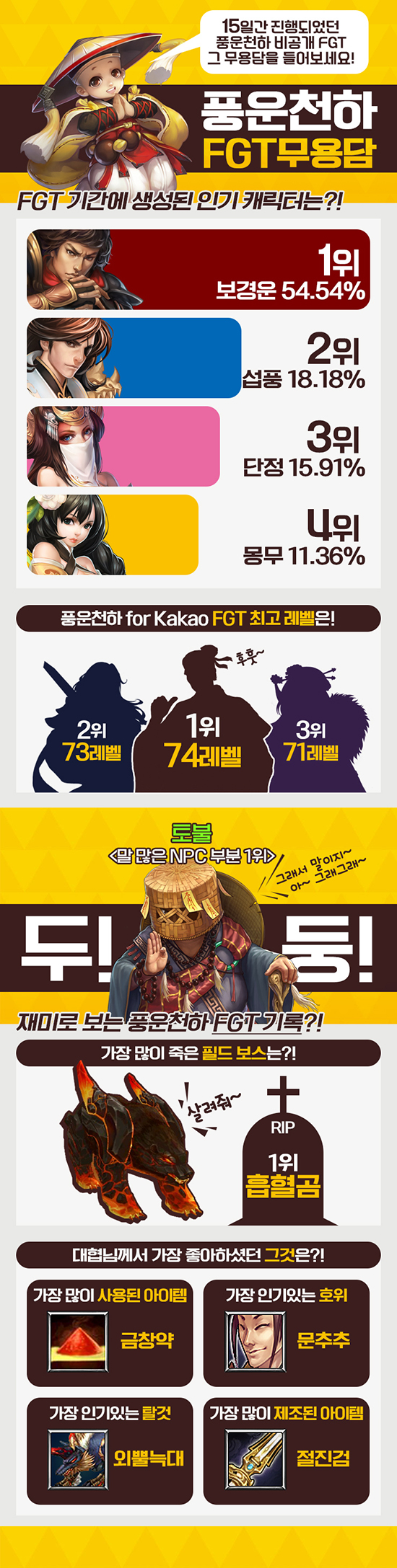 ·±Äª ÀÓ¹ÚÀ» ¾Ë¸° ¡®Ç³¿îõÇÏ for Kakao¡¯´Â °ÔÀÓÀÇ ¿Ï¼ºµµ¸¦ º¸´Ù ³ôÀ̱â À§ÇØ 15Àϰ£ FGT¸¦ ÁøÇàÇØ °ÔÀÓÀ» °ËÁõÇß´Ù. À̹ø¿¡ °ø°³ÇÑ ÀÌ»ö ÀÎÆ÷±×·¡ÇÈÀº FGTÀÇ µ¥ÀÌÅ͸¦ Á¾ÇÕÇÑ °ÍÀ¸·Î, °ÔÀÓÀÇ ¸Å·ÂÀ» °£Á¢ÀûÀ¸·Î üÇèÇÒ ¼ö ÀÖµµ·Ï Çß´Ù.